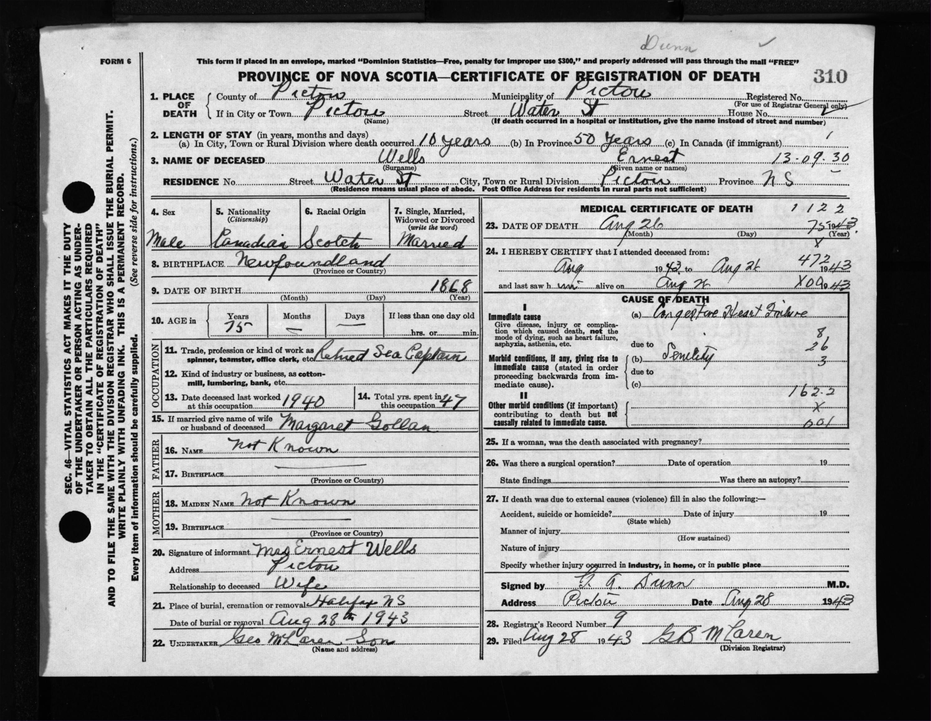 Male Death Registration: Year: 1943 file: 215 number: 310