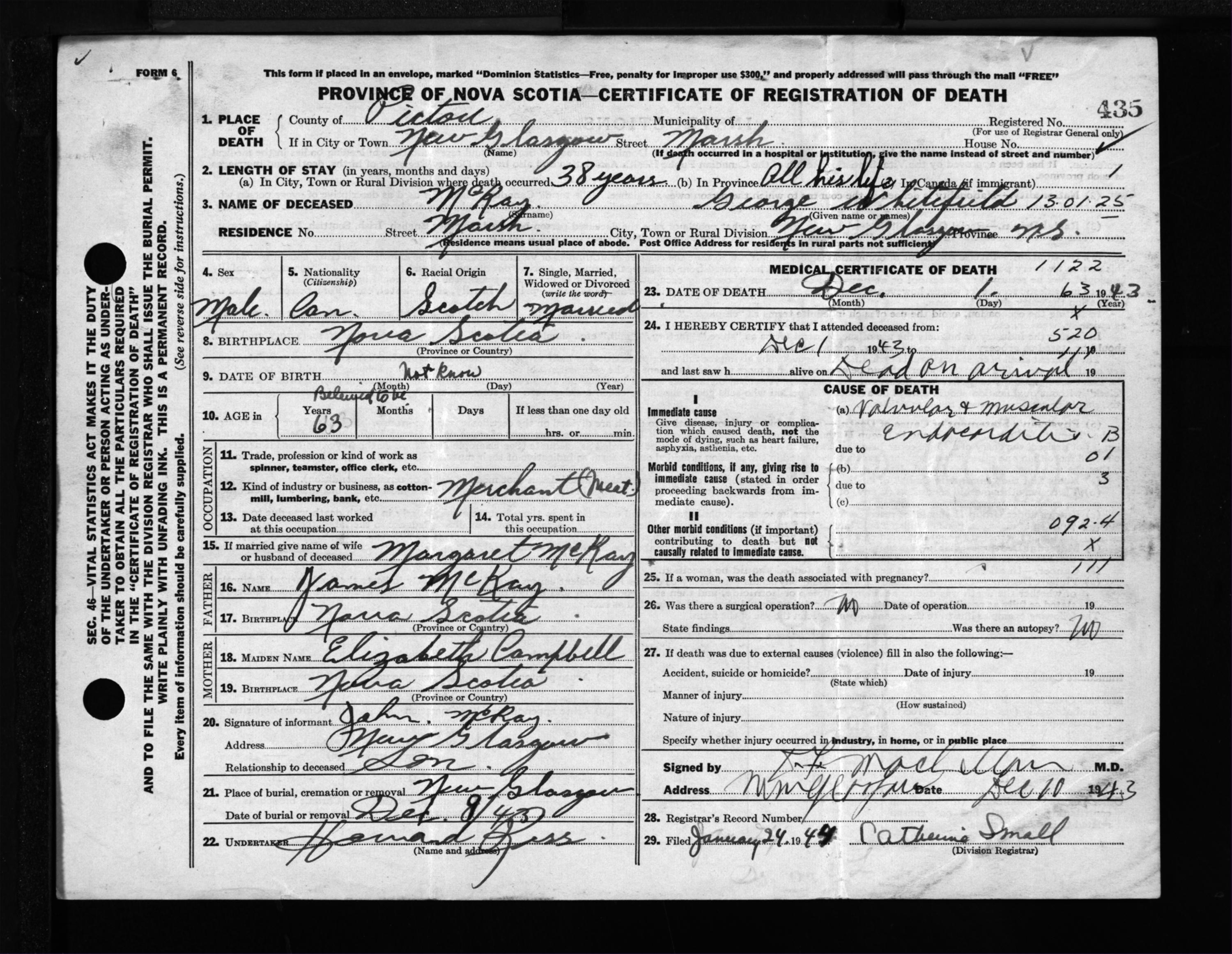 Male Death Registration: Year: 1943 file: 215 number: 435