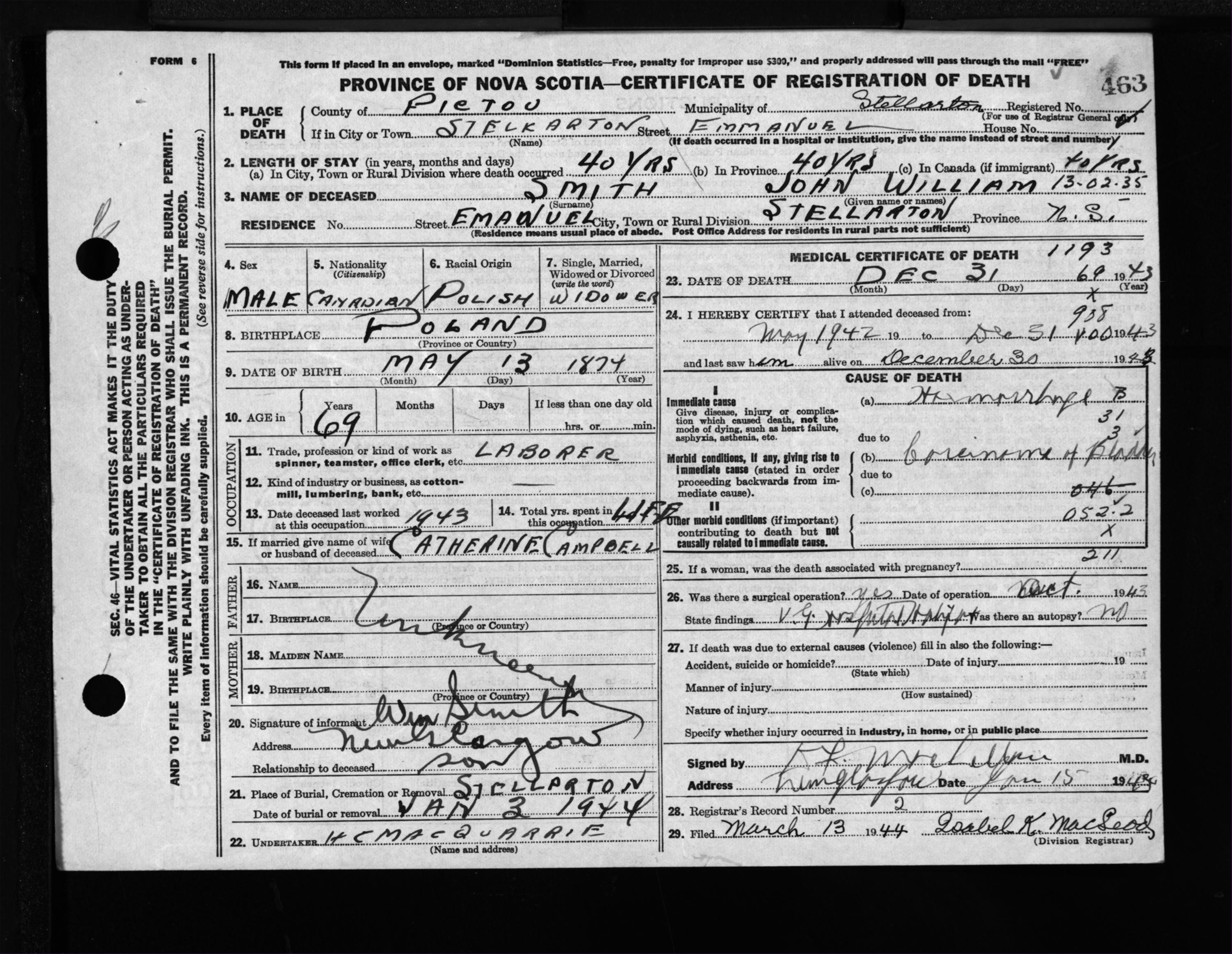 Death Registration: Year: 1943 file: 215 number: 463