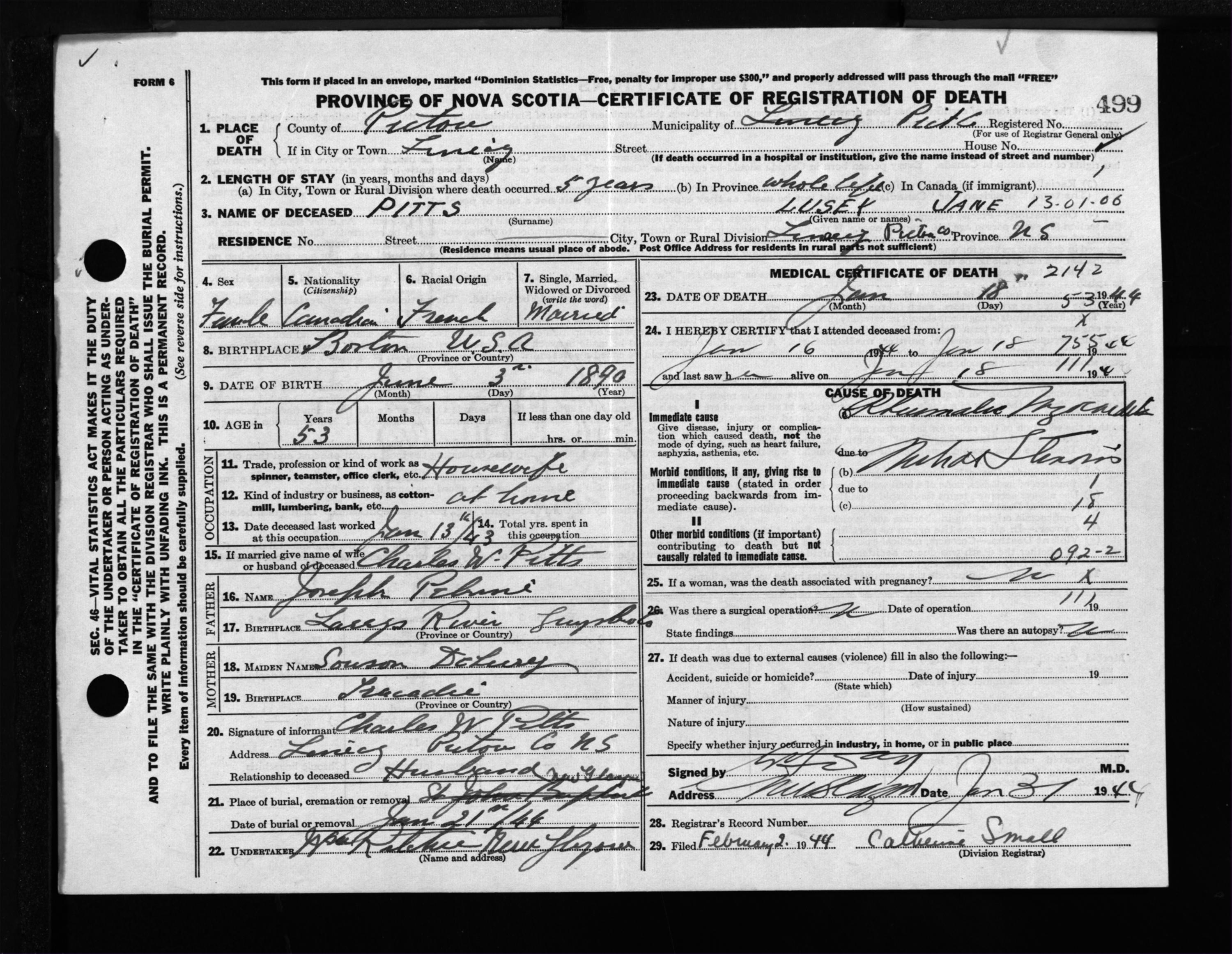 Female Death Registration: Year: 1944 file: 215 number: 499