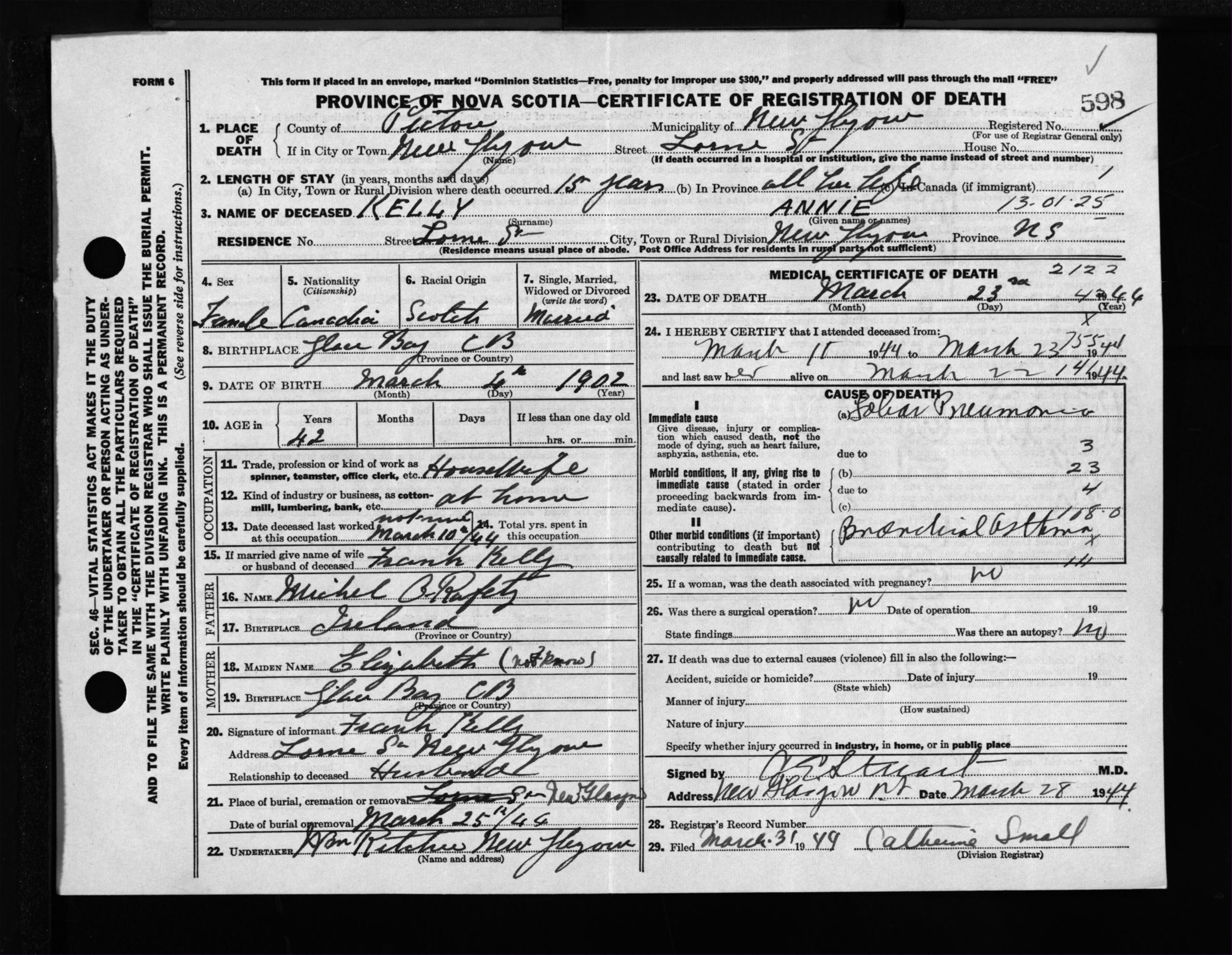 Female Death Registration: Year: 1944 file: 215 number: 598