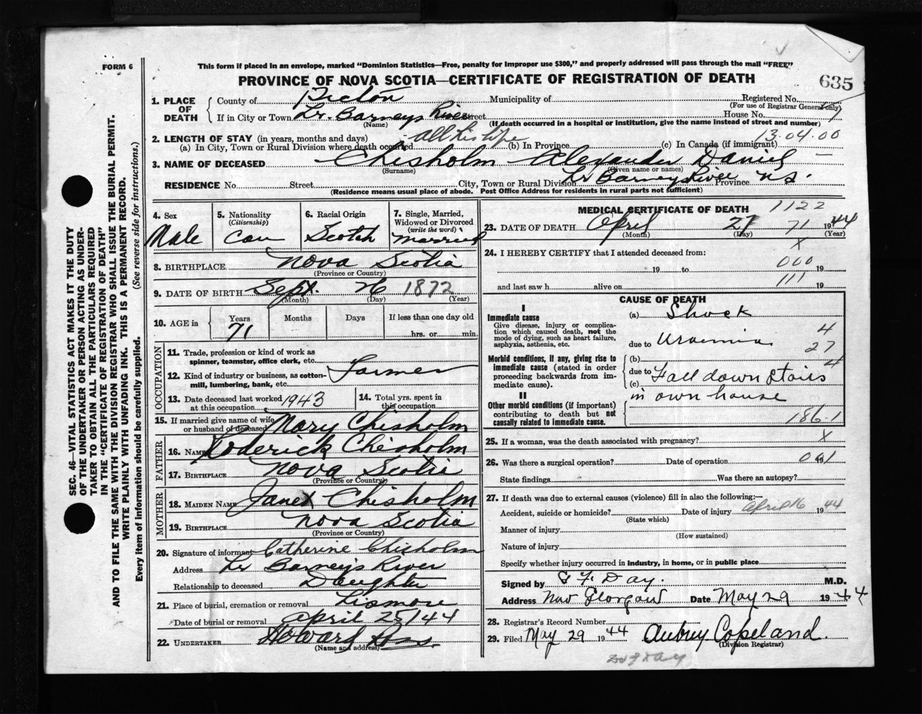 Male Death Registration: Year: 1944 file: 215 number: 635