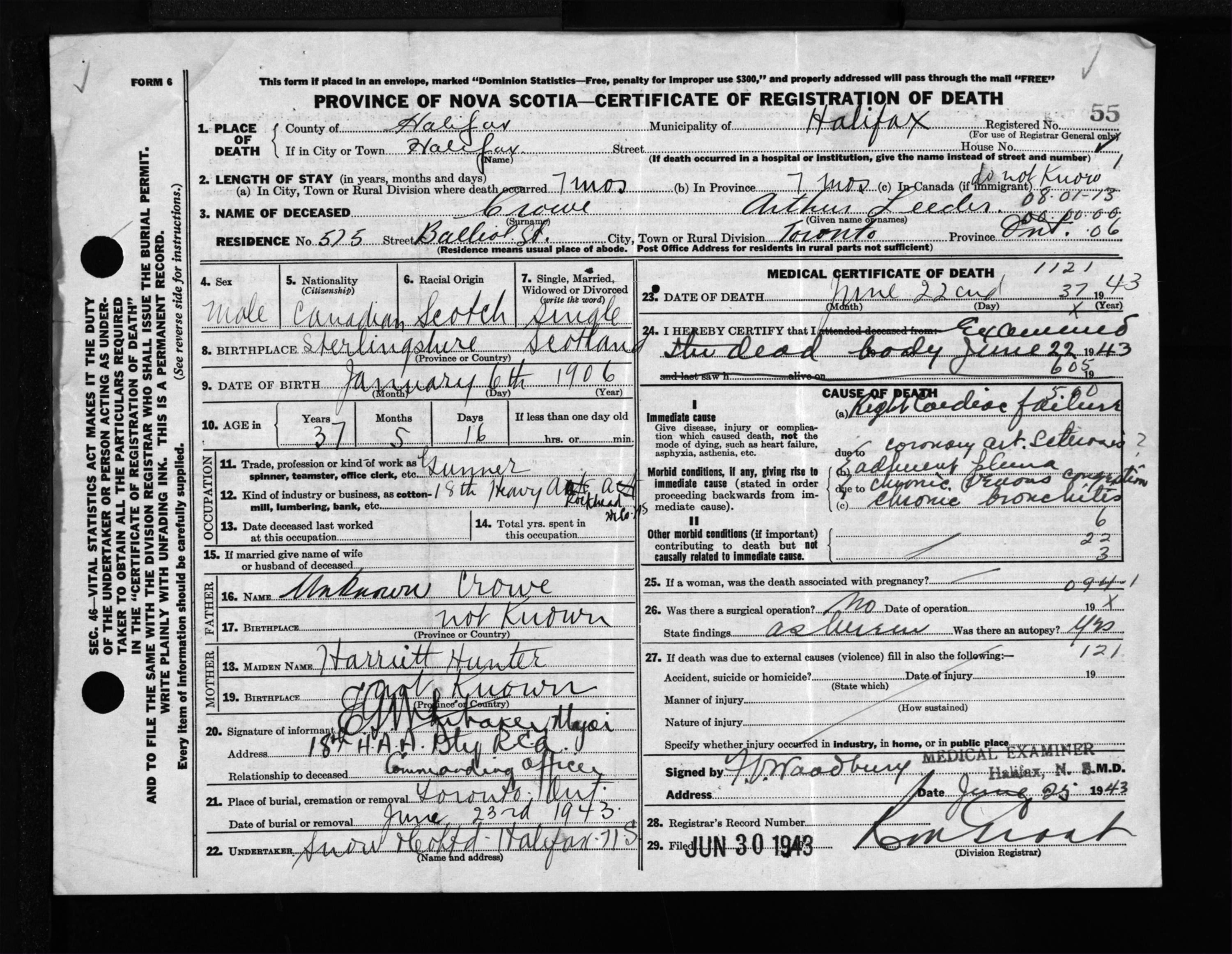 Male Death Registration: Year: 1943 file: 216 number: 55