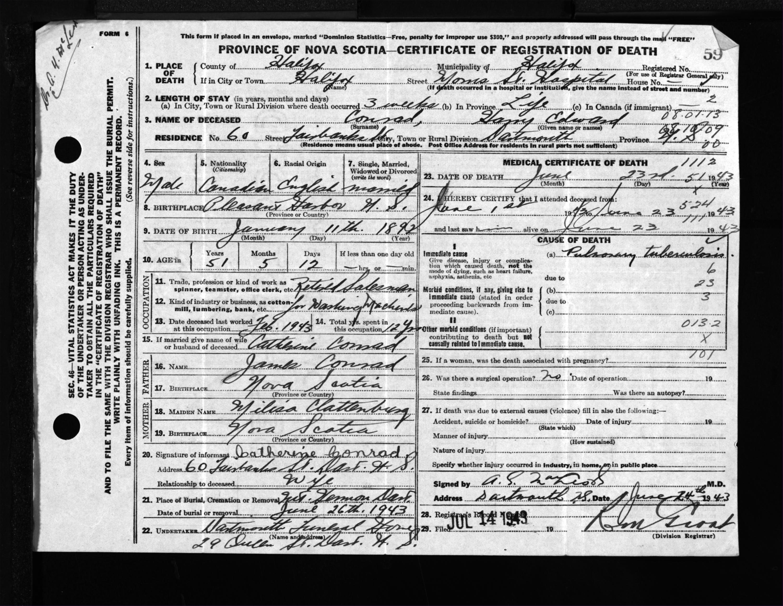 Male Death Registration: Year: 1943 file: 216 number: 59