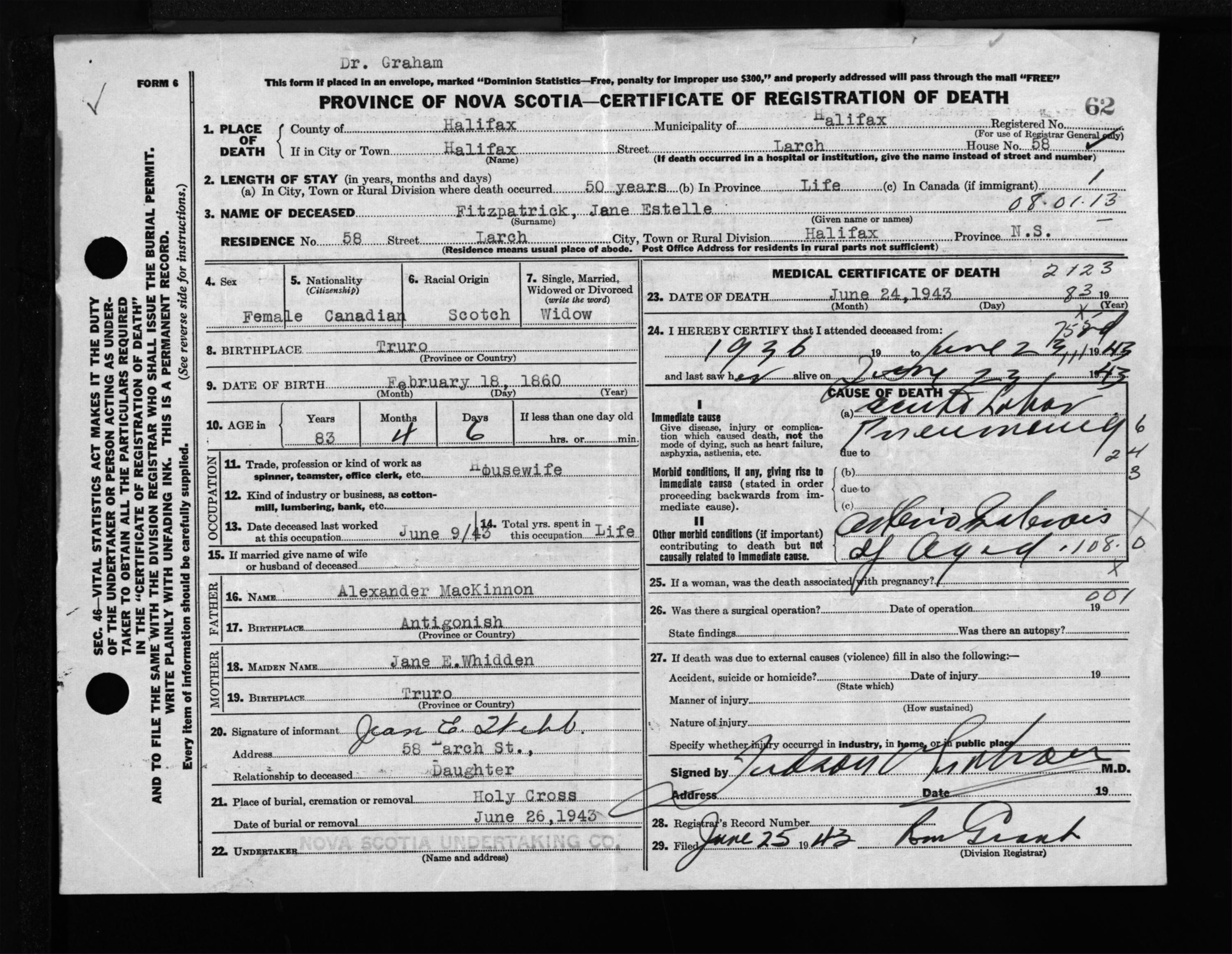 Female Death Registration: Year: 1943 file: 216 number: 62