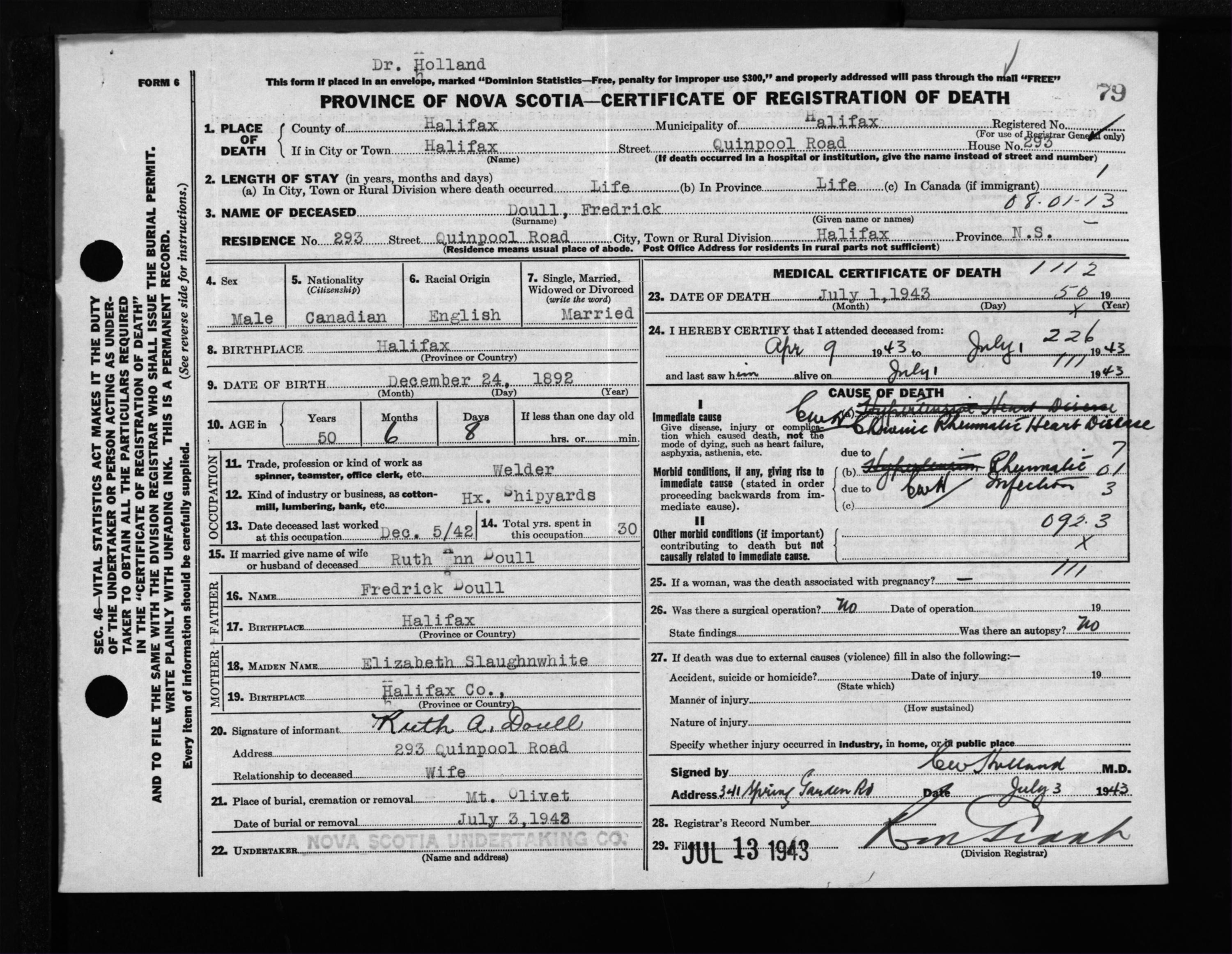 Male Death Registration: Year: 1943 file: 216 number: 79
