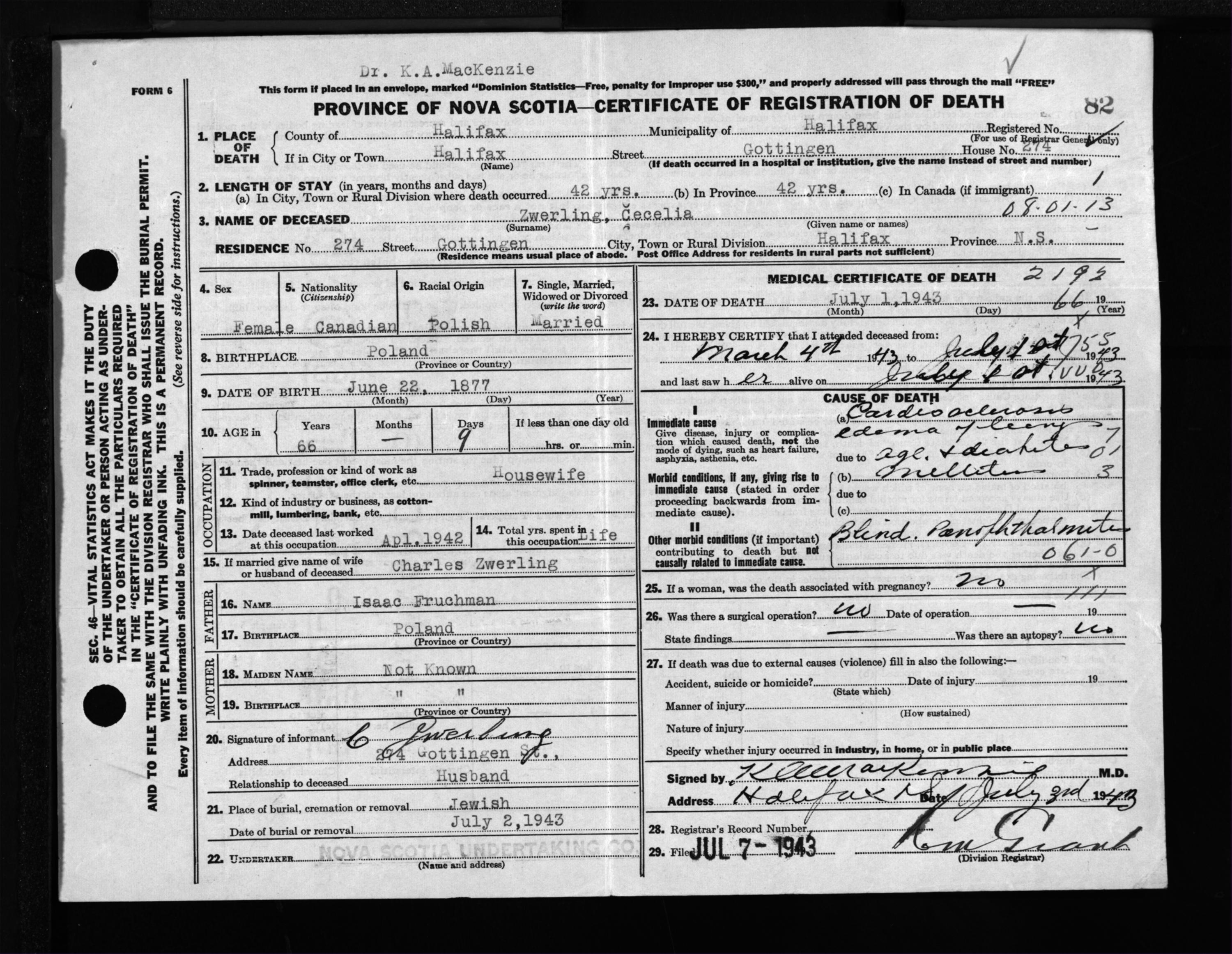 Female Death Registration: Year: 1943 file: 216 number: 82