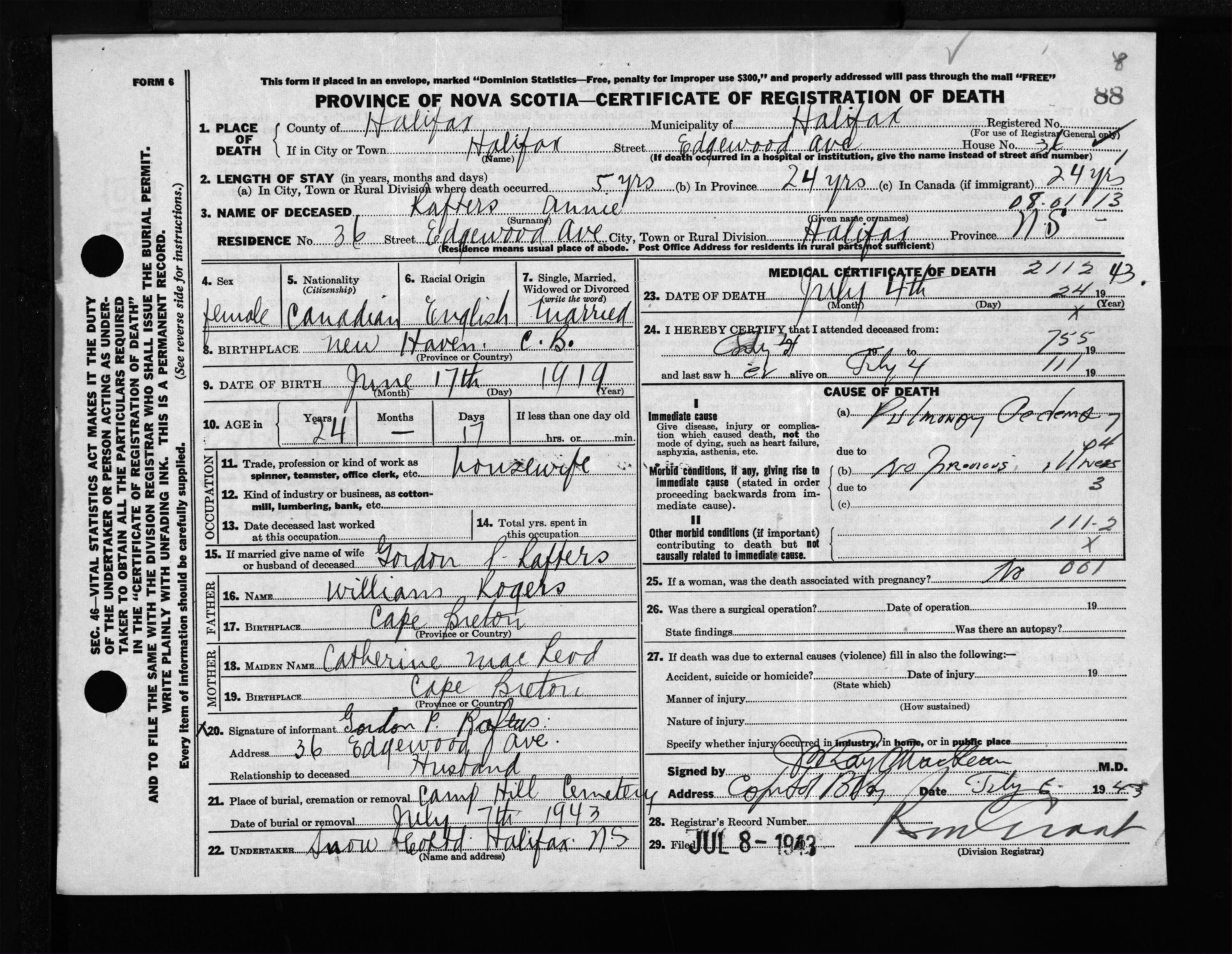 Female Death Registration: Year: 1943 file: 216 number: 88