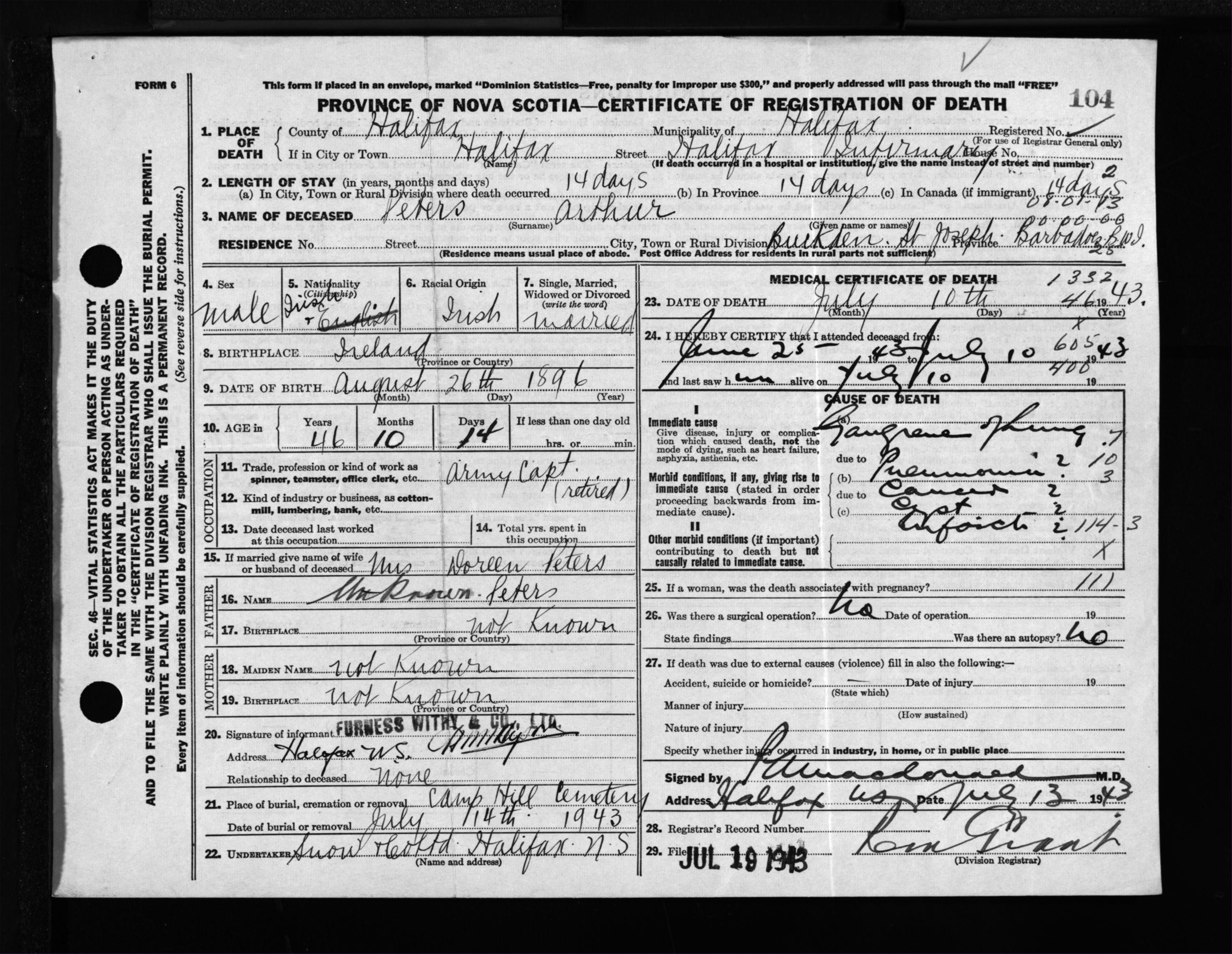 Male Death Registration: Year: 1943 file: 216 number: 104