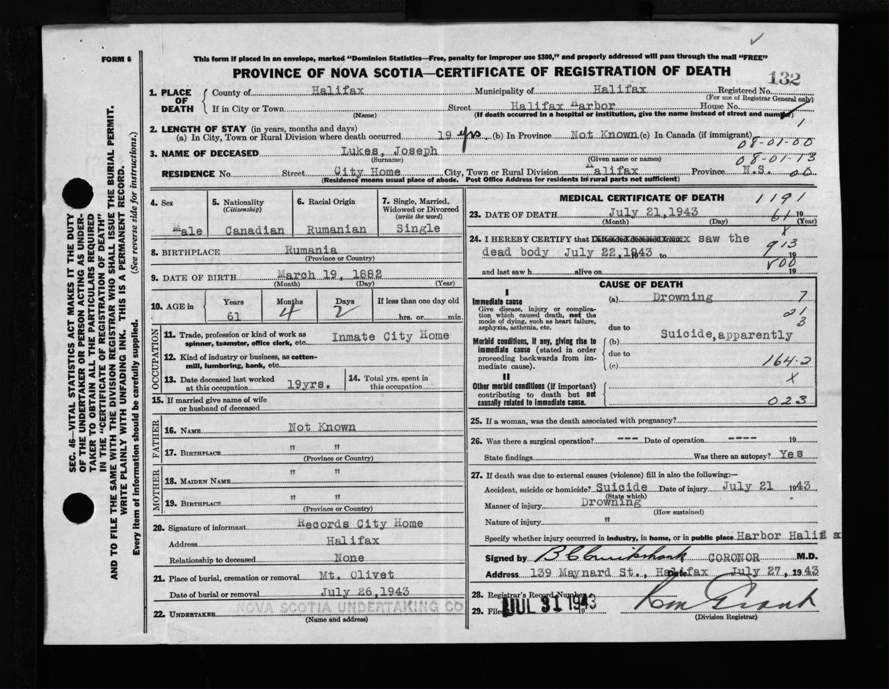 Male Death Registration: Year: 1943 file: 216 number: 132
