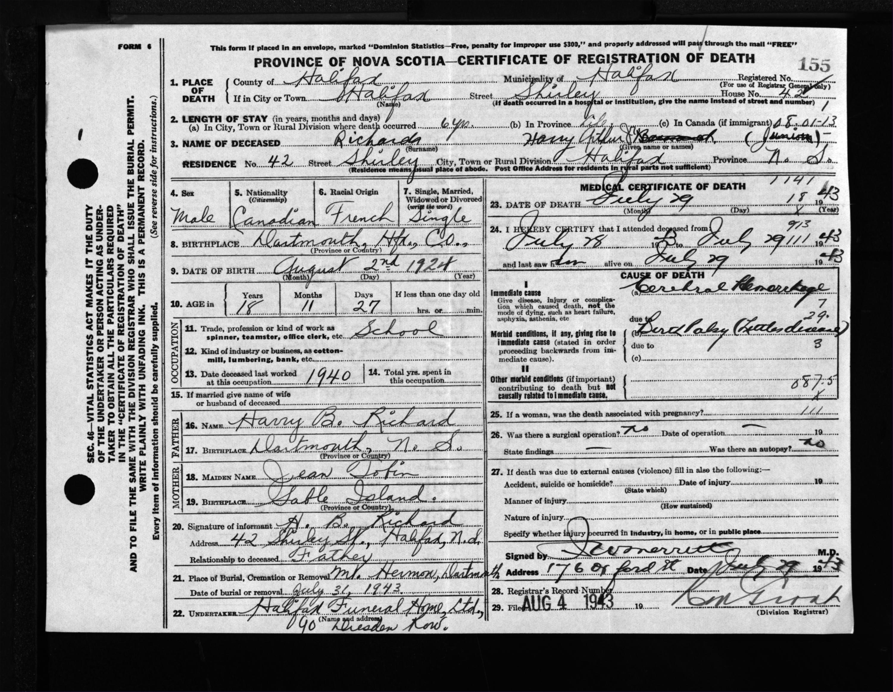 Male Death Registration: Year: 1943 file: 216 number: 155