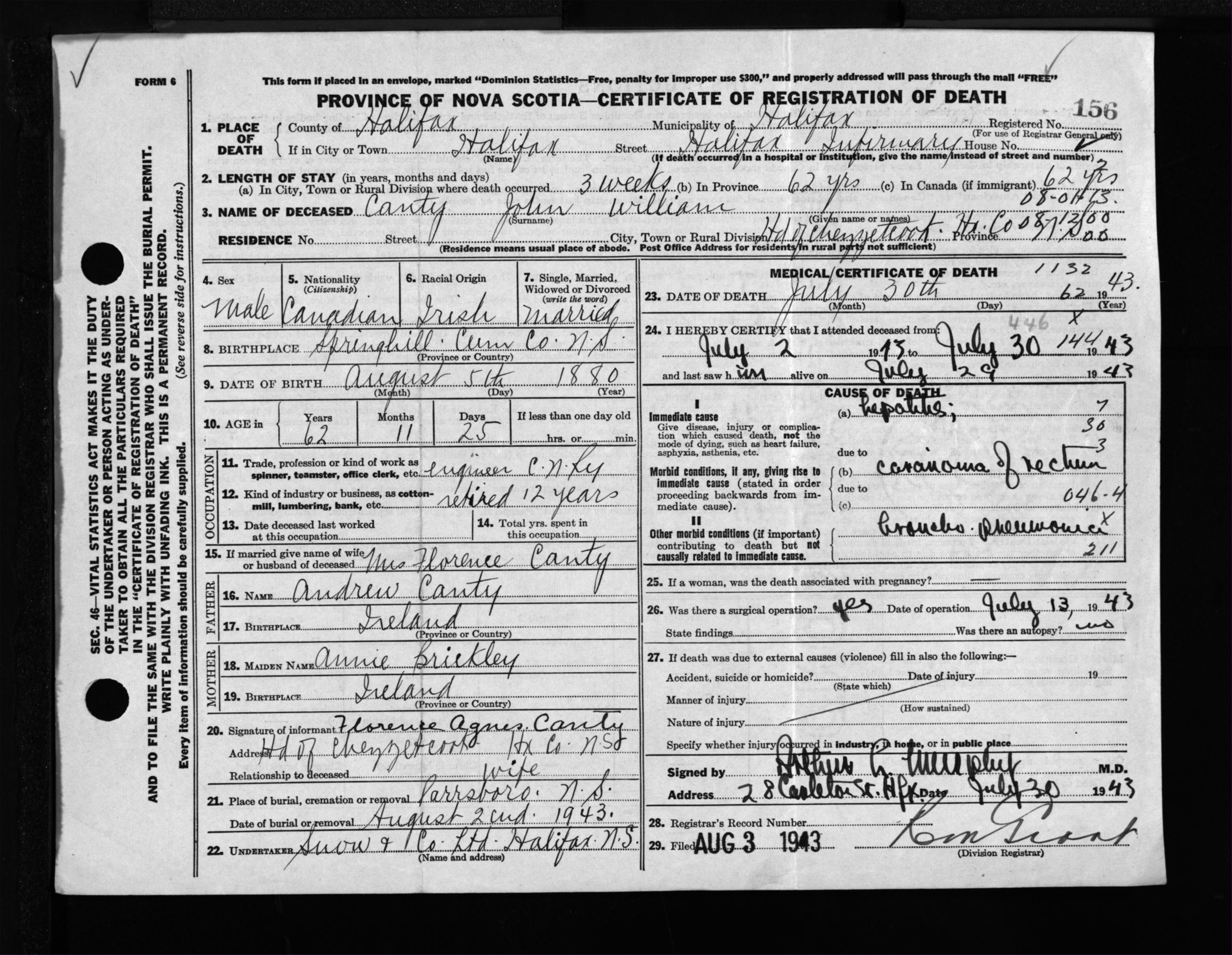 Male Death Registration: Year: 1943 file: 216 number: 156