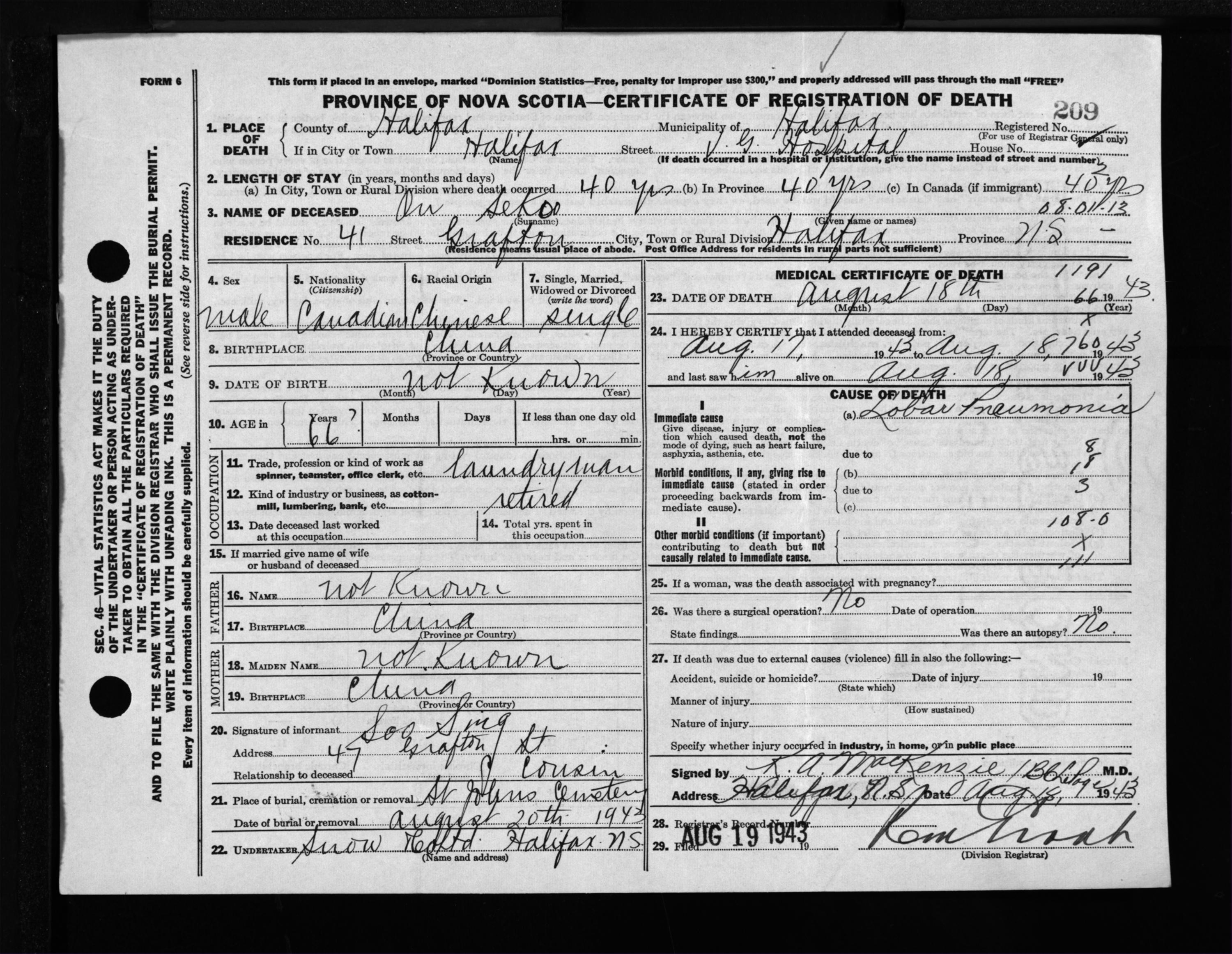 Male Death Registration: Year: 1943 file: 216 number: 209