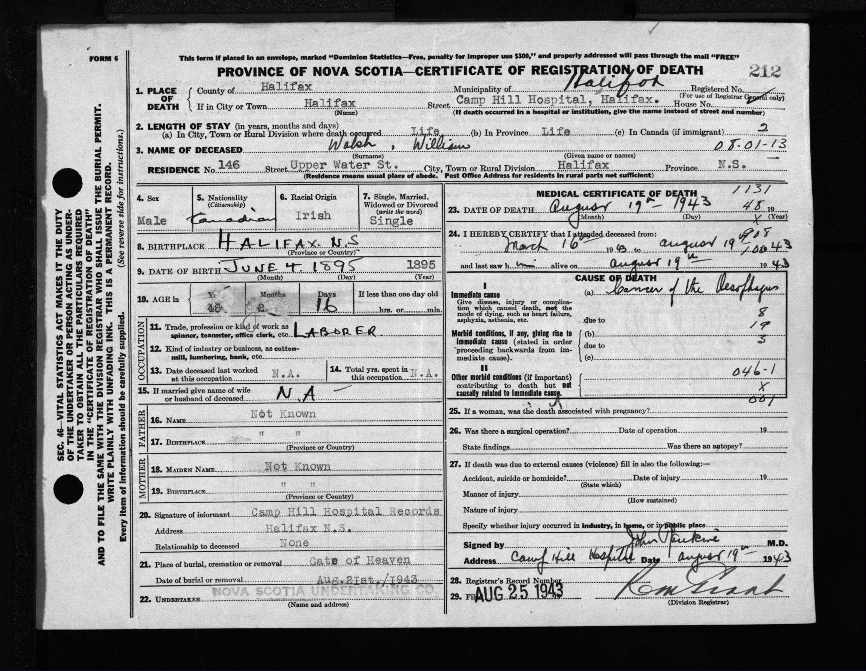 Male Death Registration: Year: 1943 file: 216 number: 212
