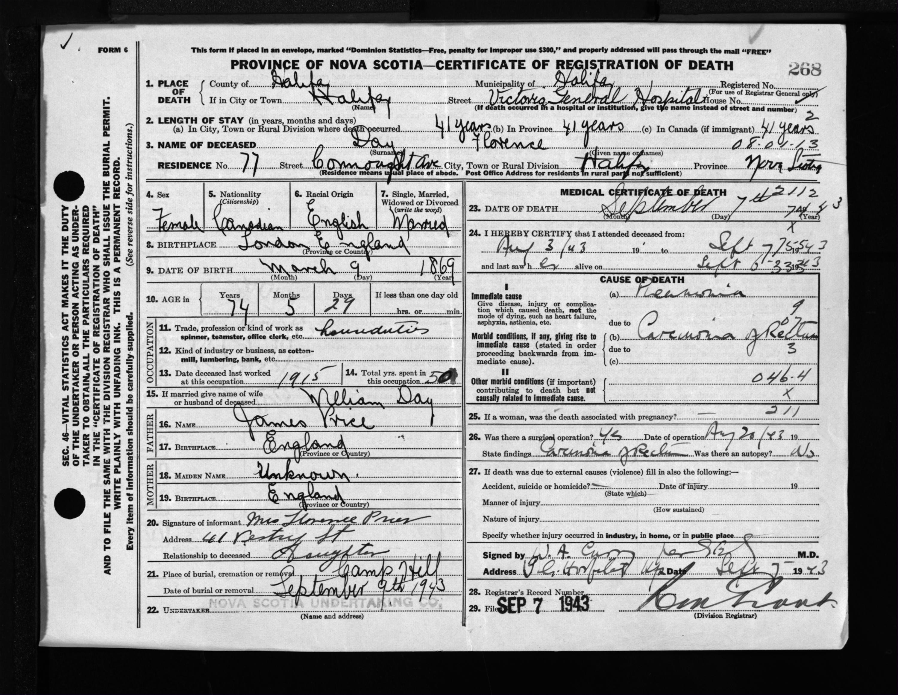Female Death Registration: Year: 1943 file: 216 number: 268