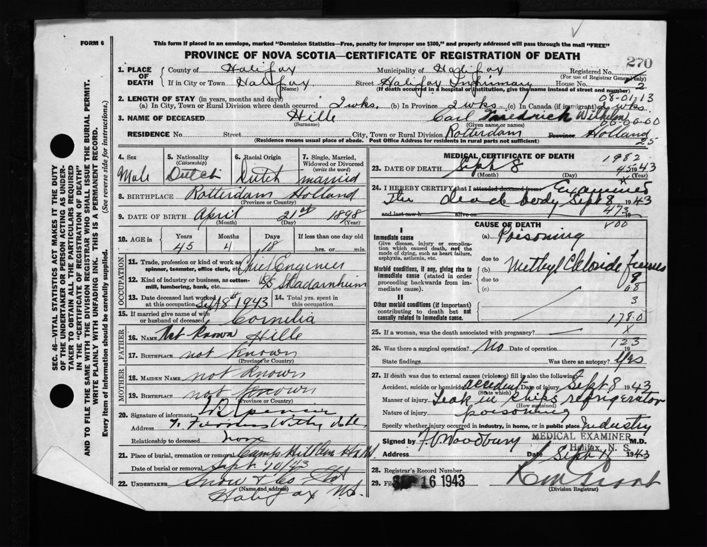 Male Death Registration: Year: 1943 file: 216 number: 270