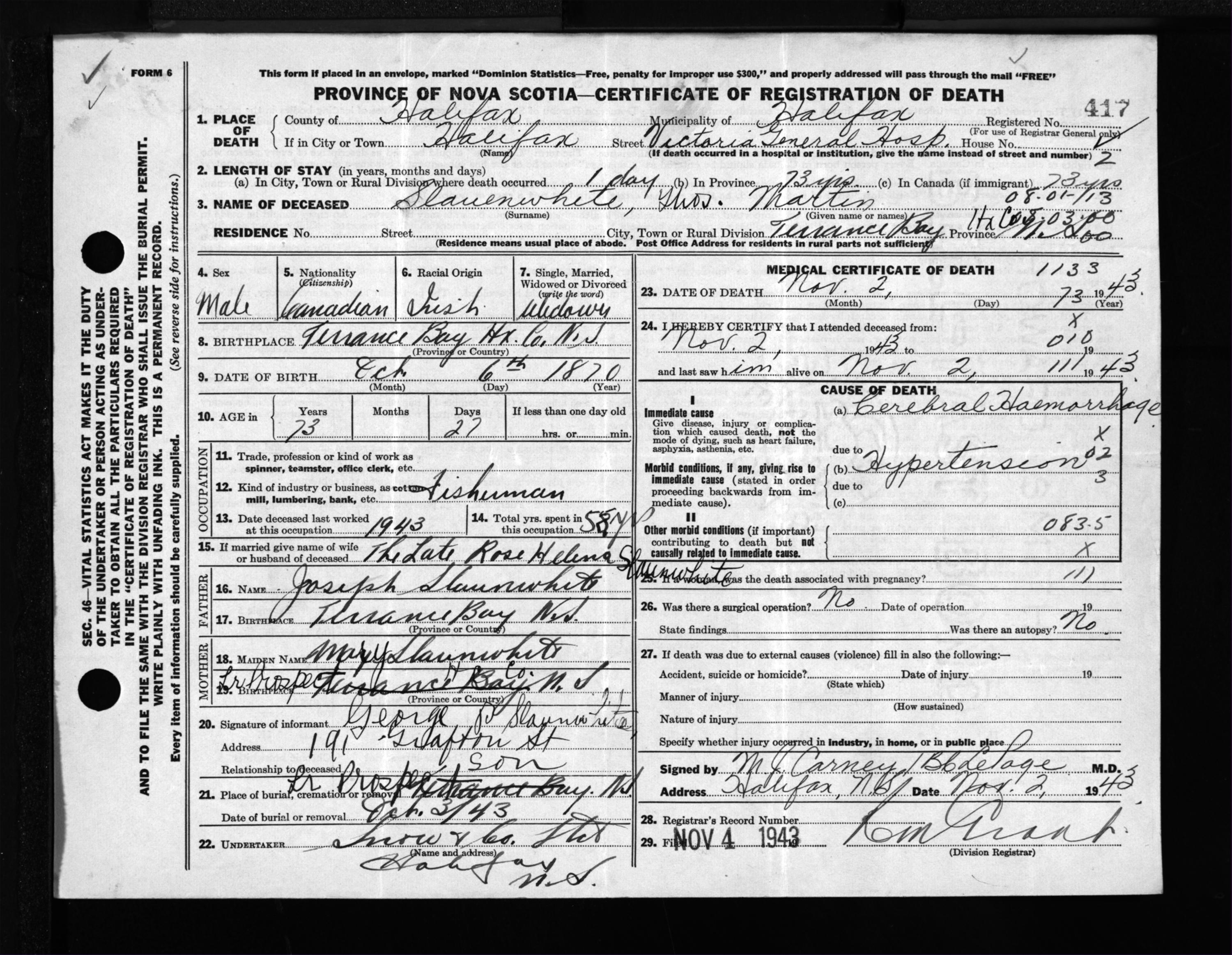 Male Death Registration: Year: 1943 file: 216 number: 417