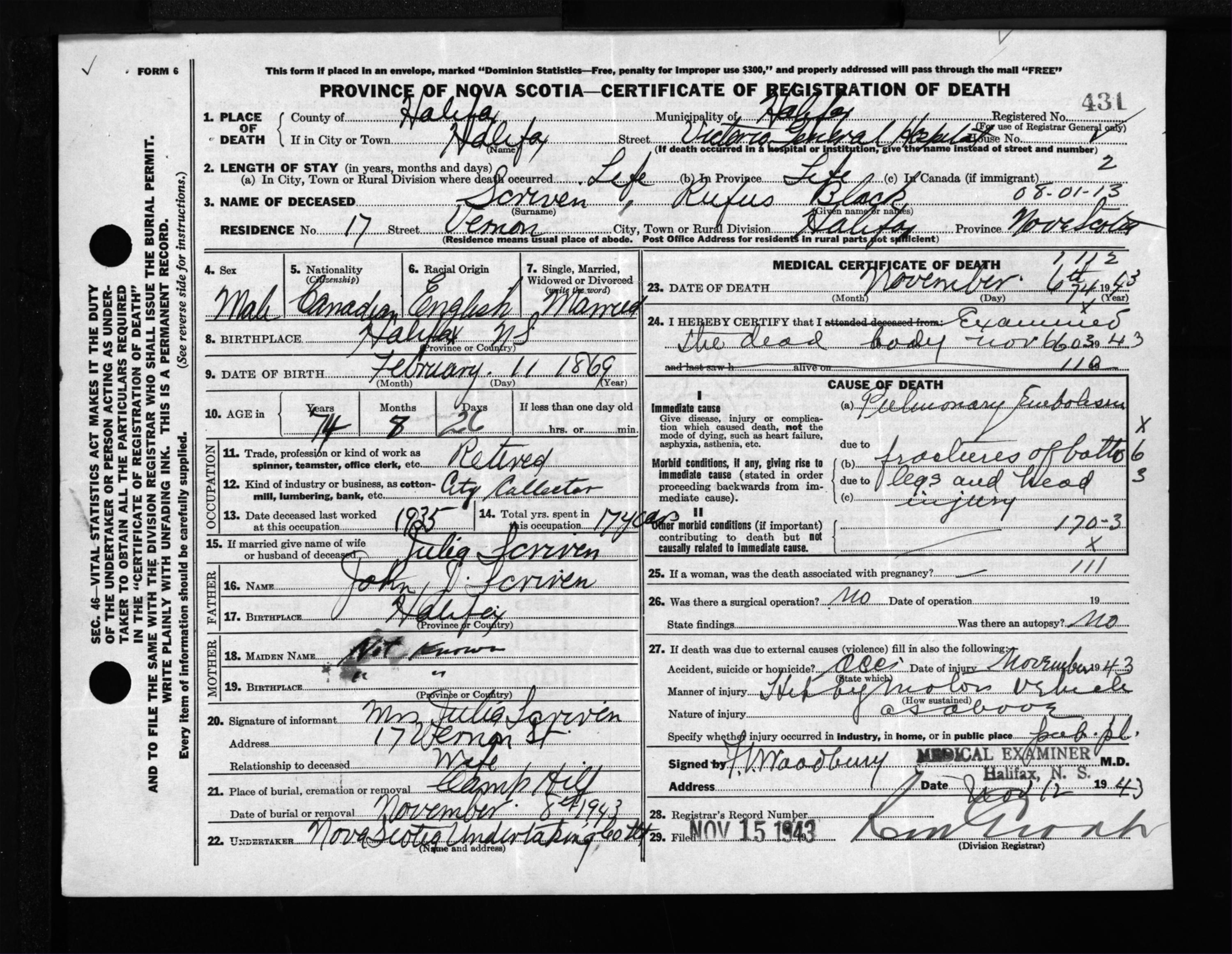 Male Death Registration: Year: 1943 file: 216 number: 431