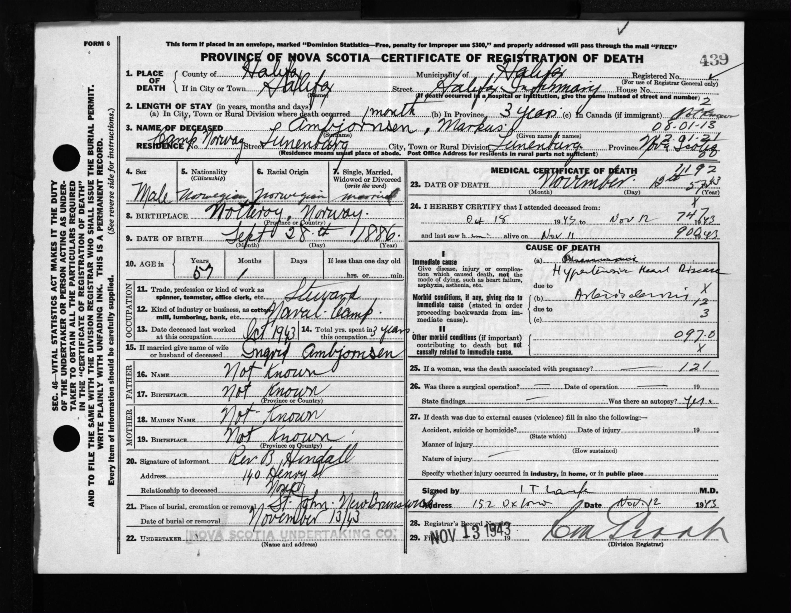 Male Death Registration: Year: 1943 file: 216 number: 439