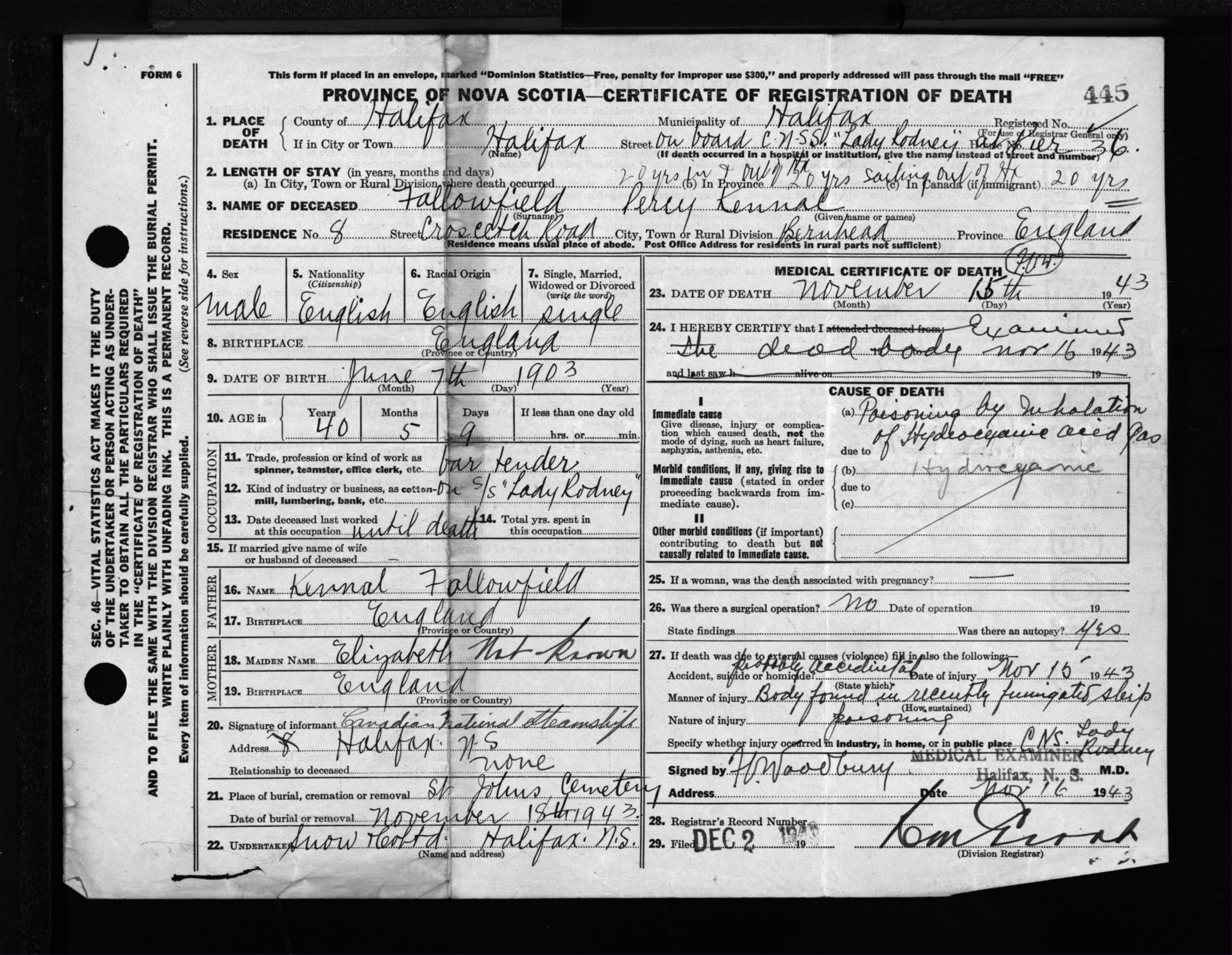 Male Death Registration: Year: 1943 file: 216 number: 445