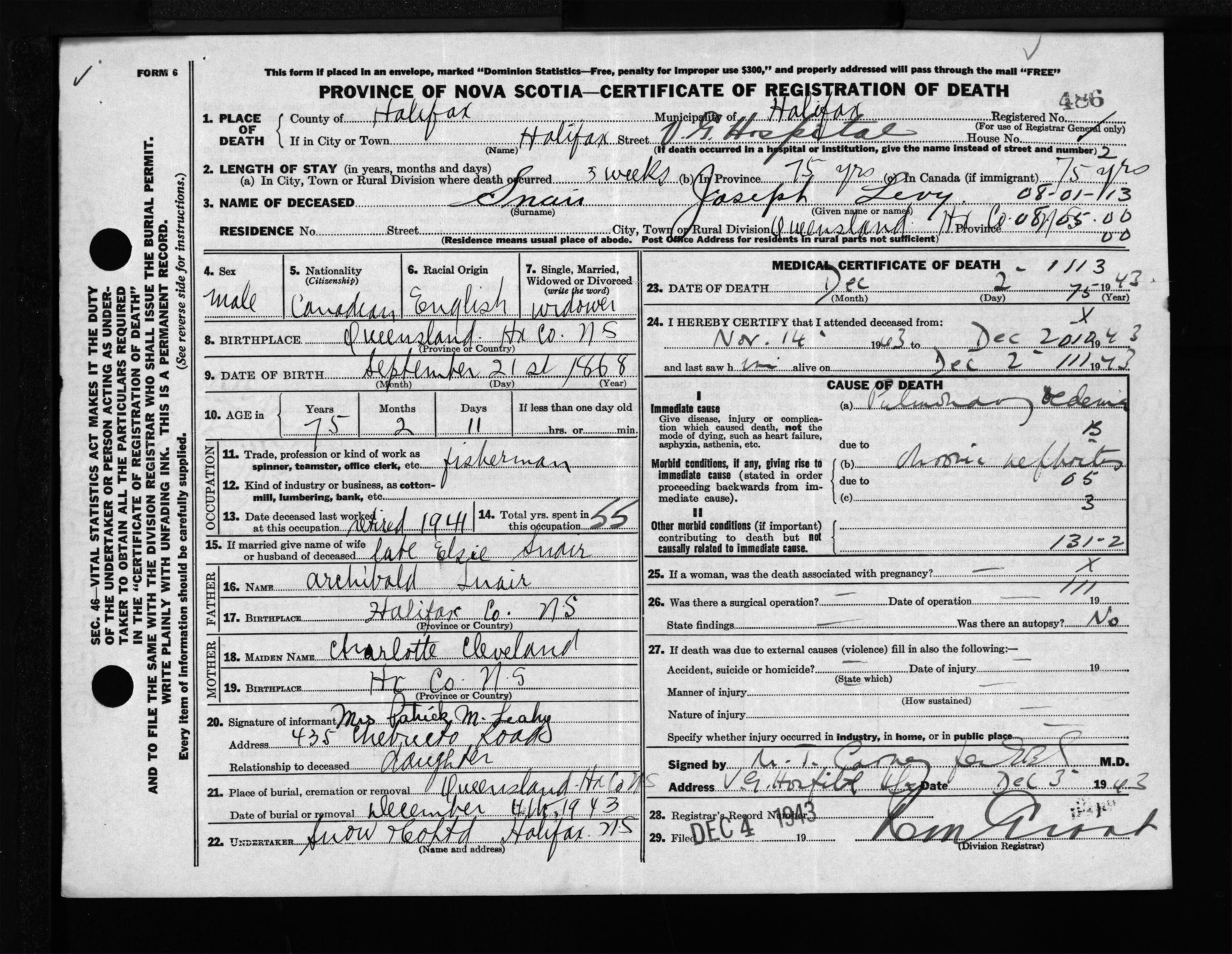 Male Death Registration: Year: 1943 file: 216 number: 486