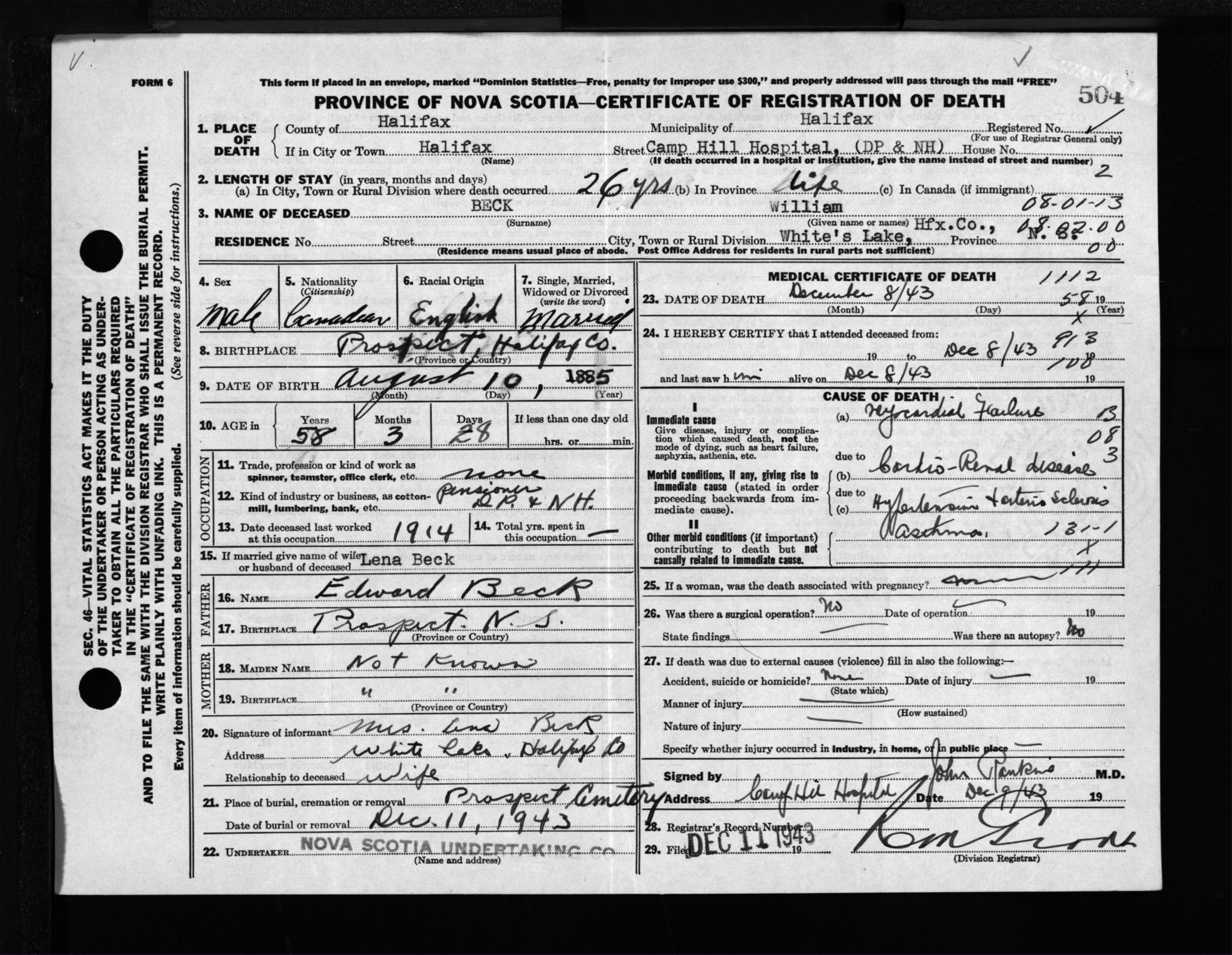 Male Death Registration: Year: 1943 file: 216 number: 504