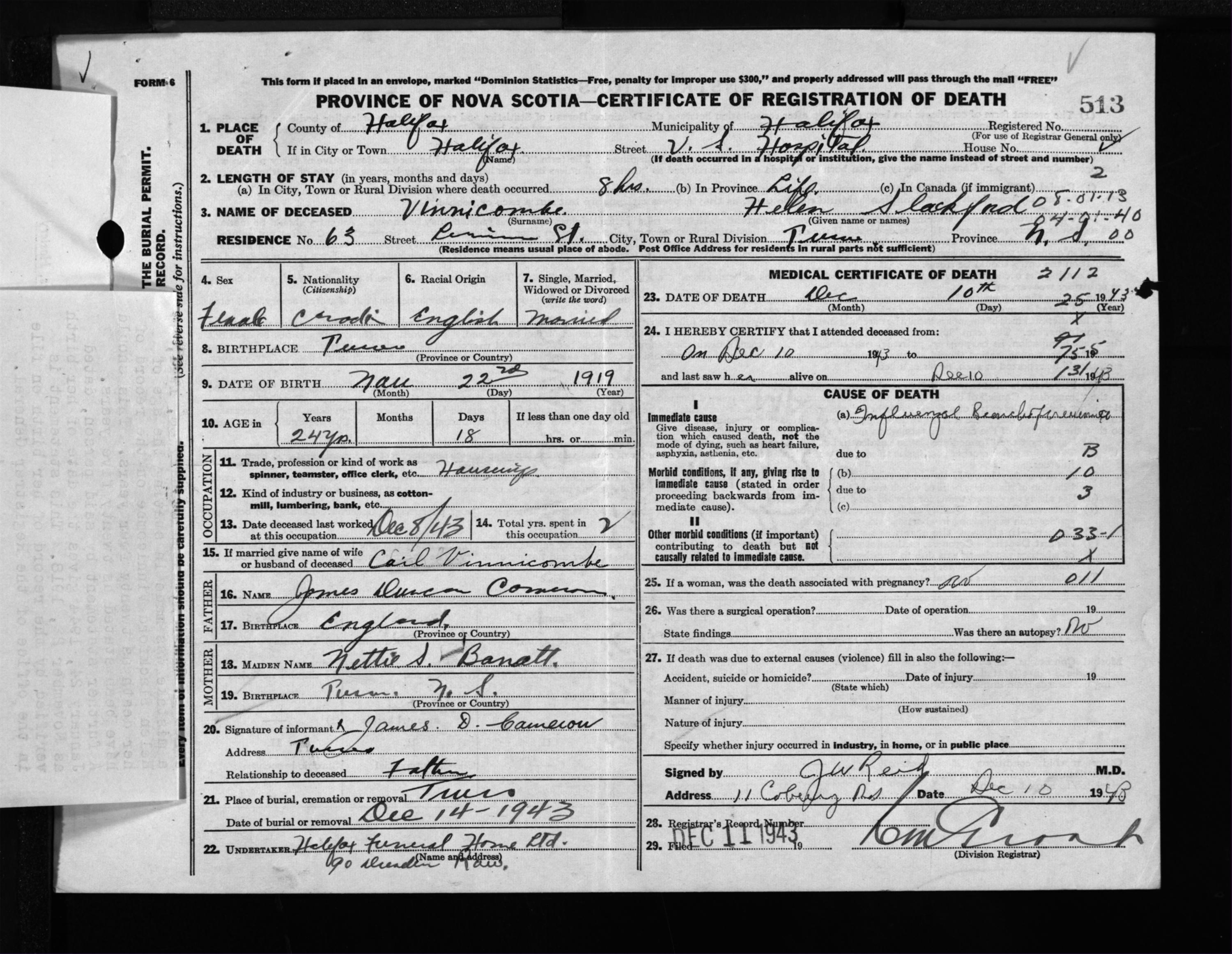 Female Death Registration: Year: 1943 file: 216 number: 513