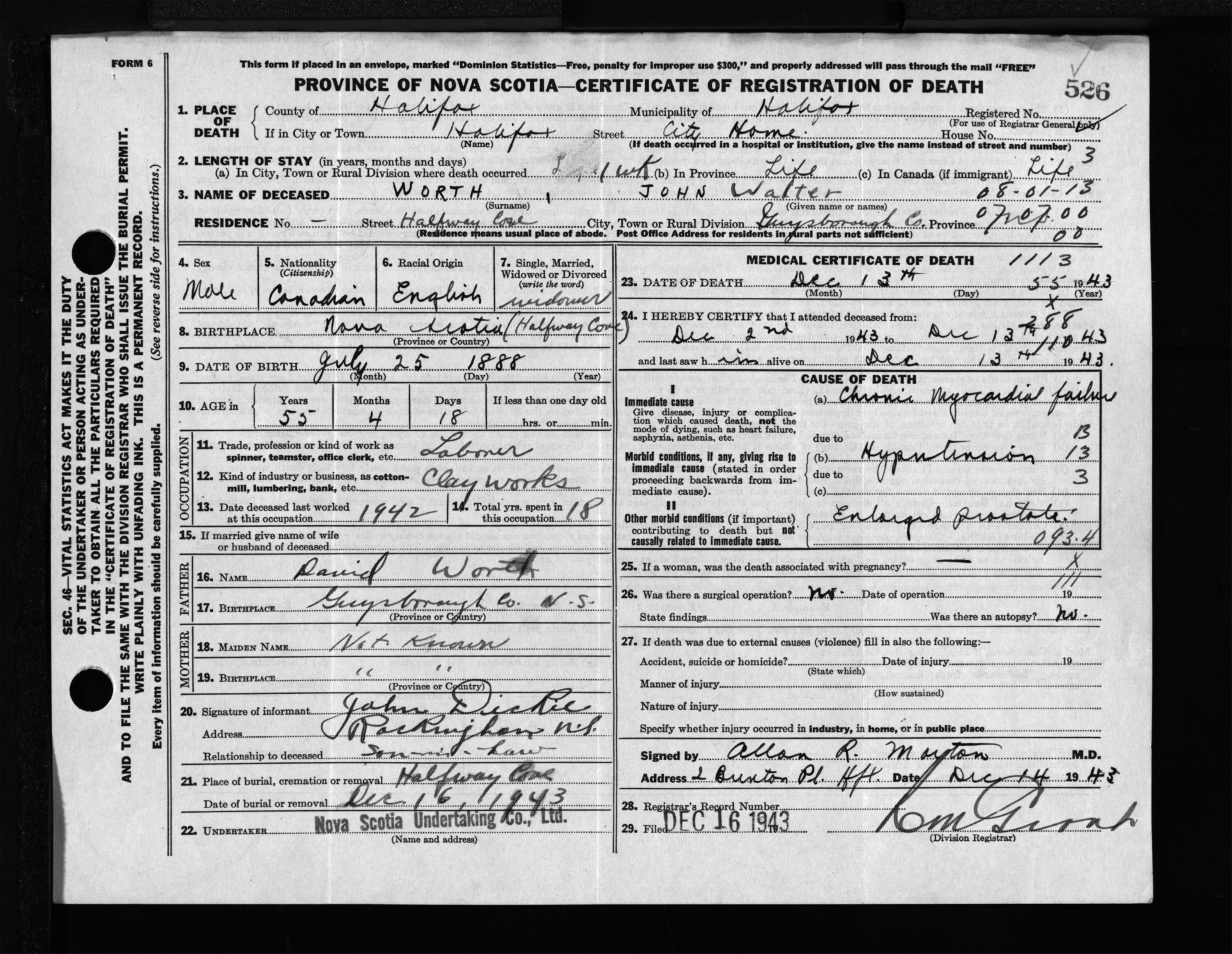 Male Death Registration: Year: 1943 file: 216 number: 526