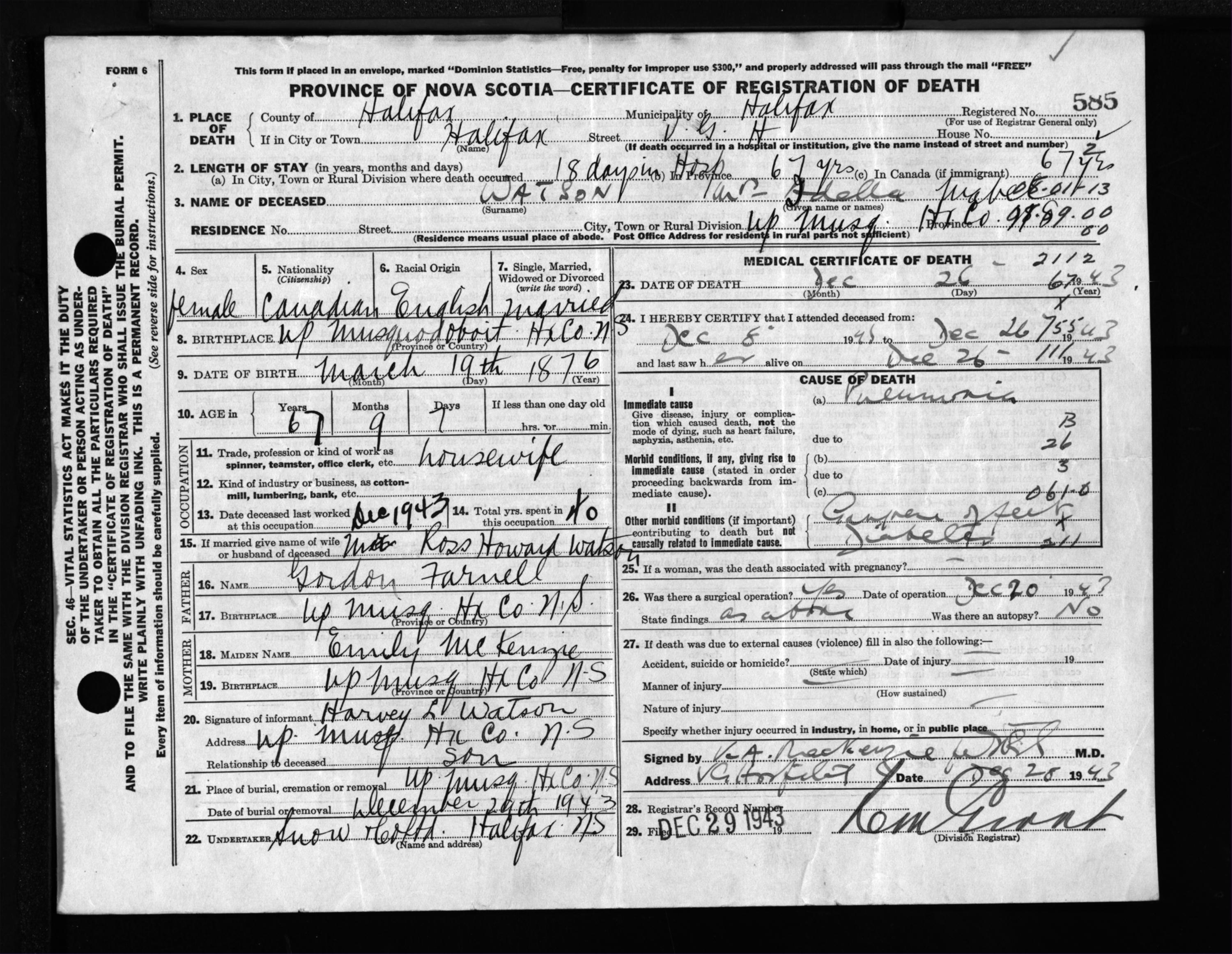 Female Death Registration: Year: 1943 file: 216 number: 585