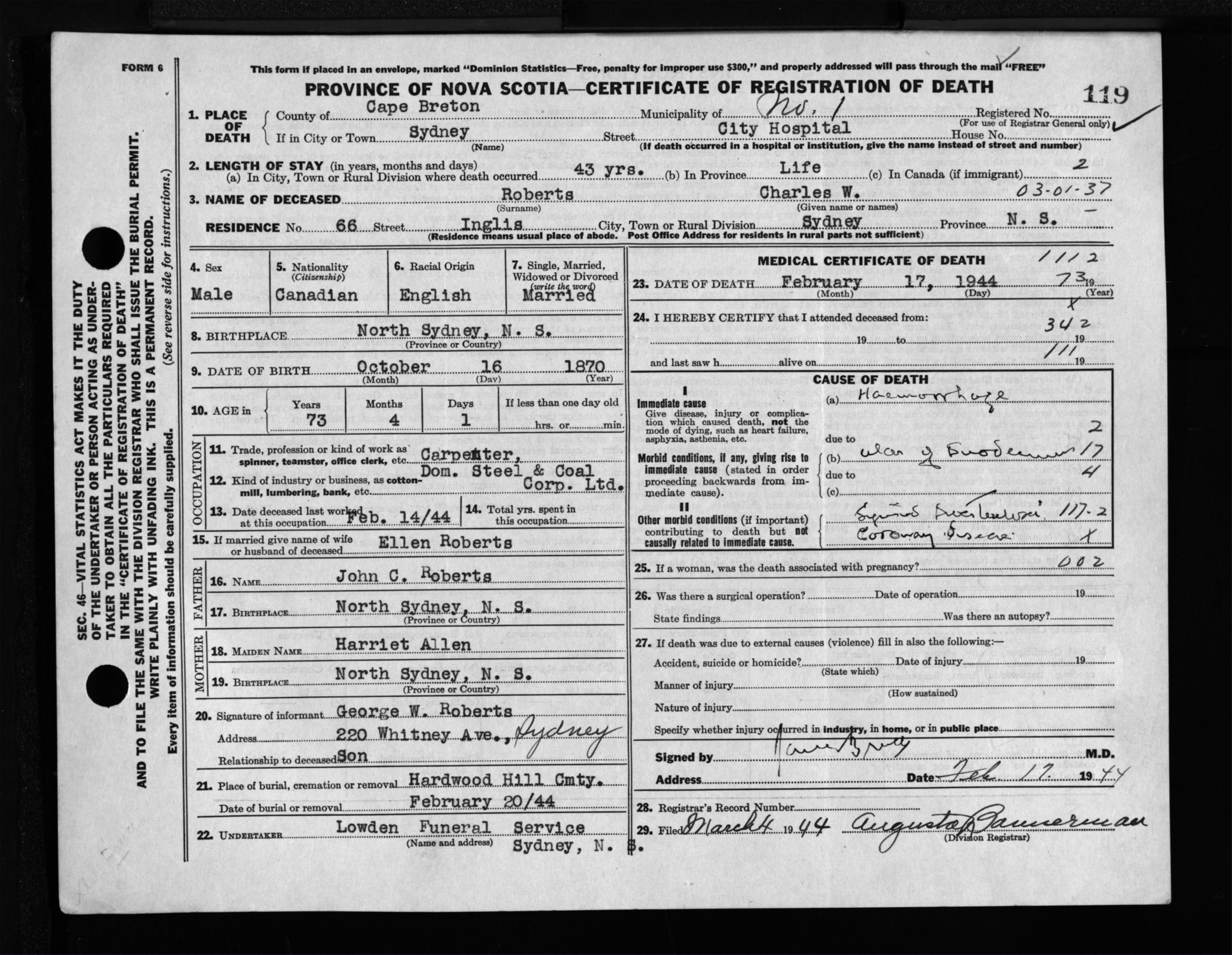 Male Death Registration: Year: 1944 file: 217 number: 119