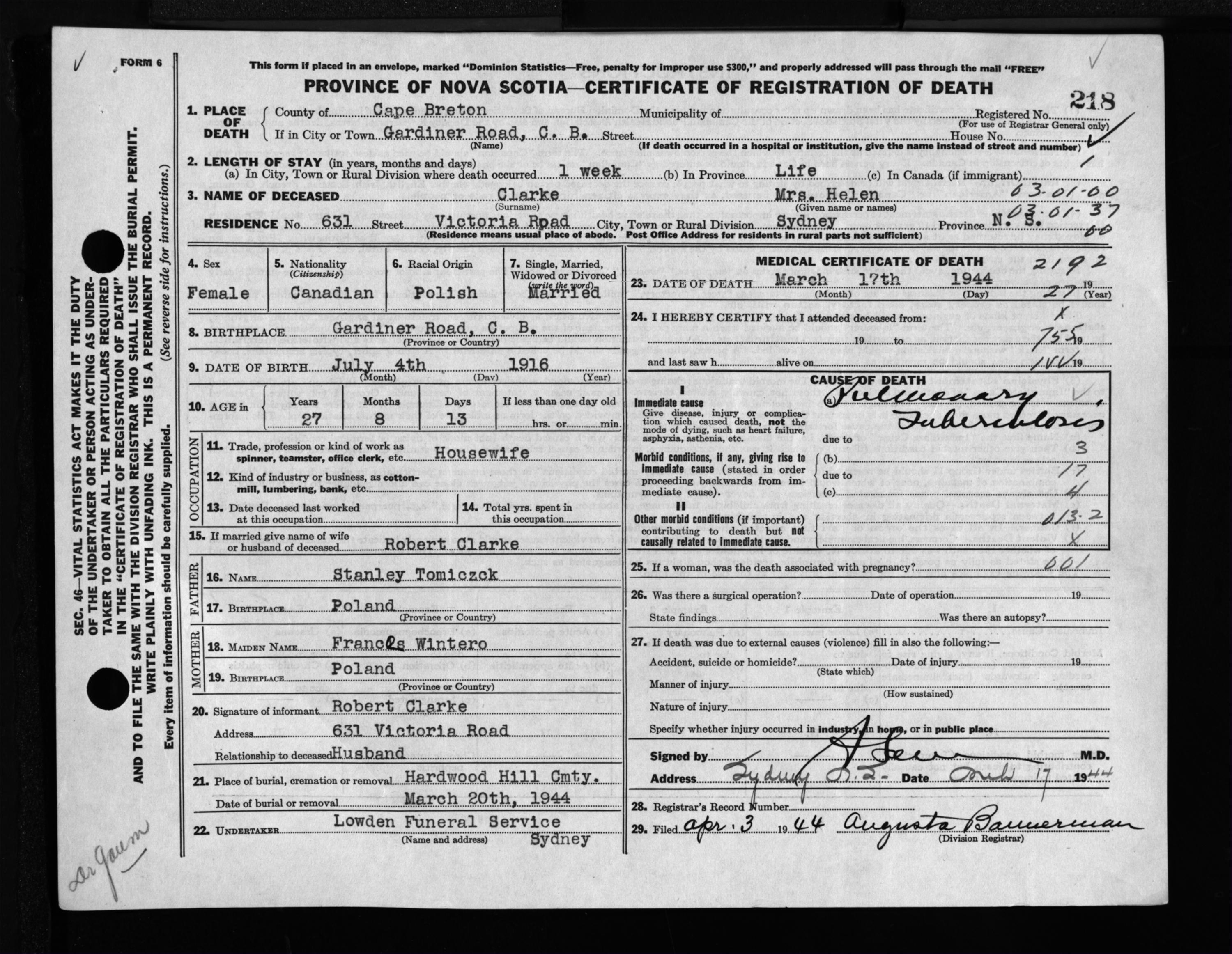 Female Death Registration: Year: 1944 file: 217 number: 218