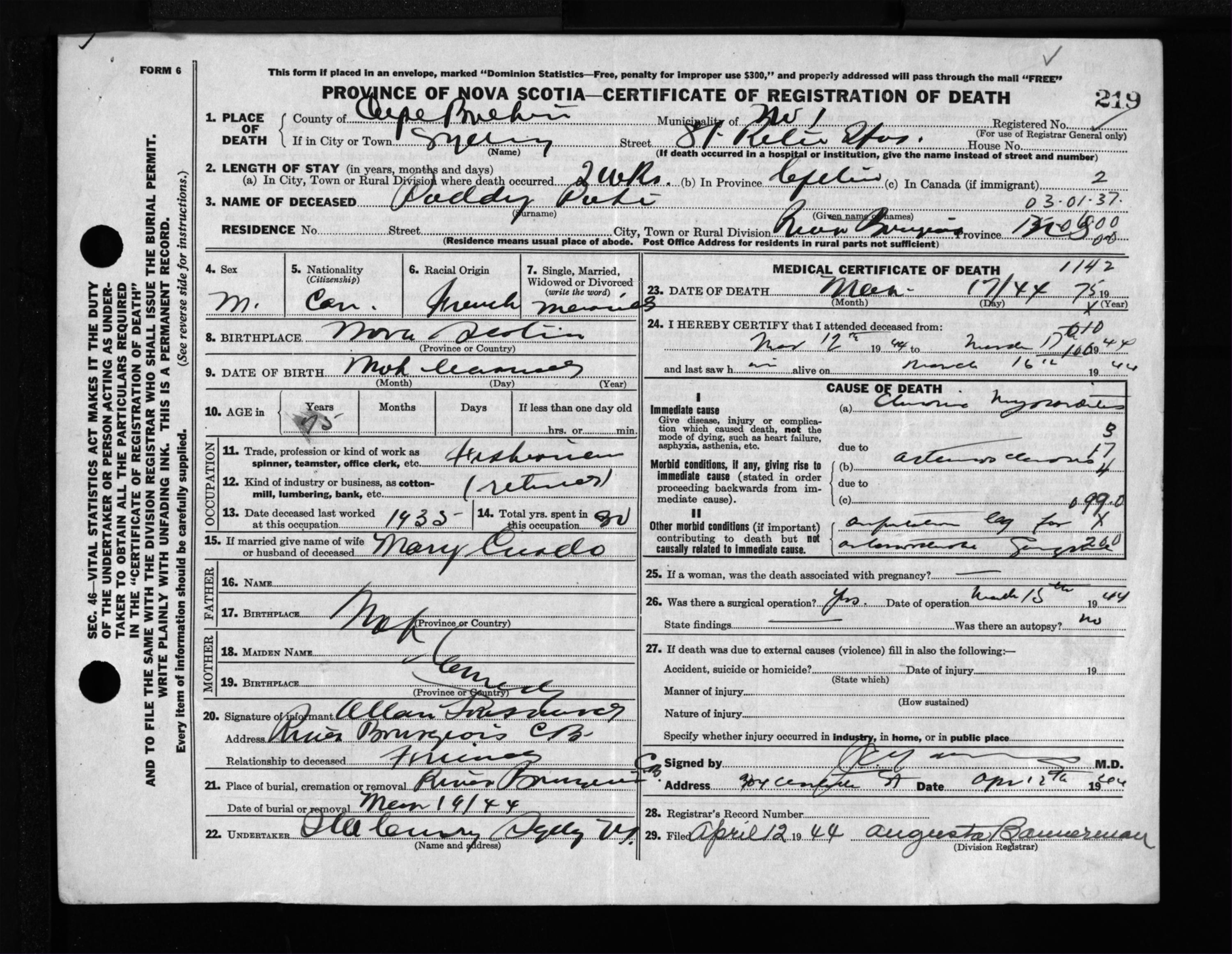 Male Death Registration: Year: 1944 file: 217 number: 219