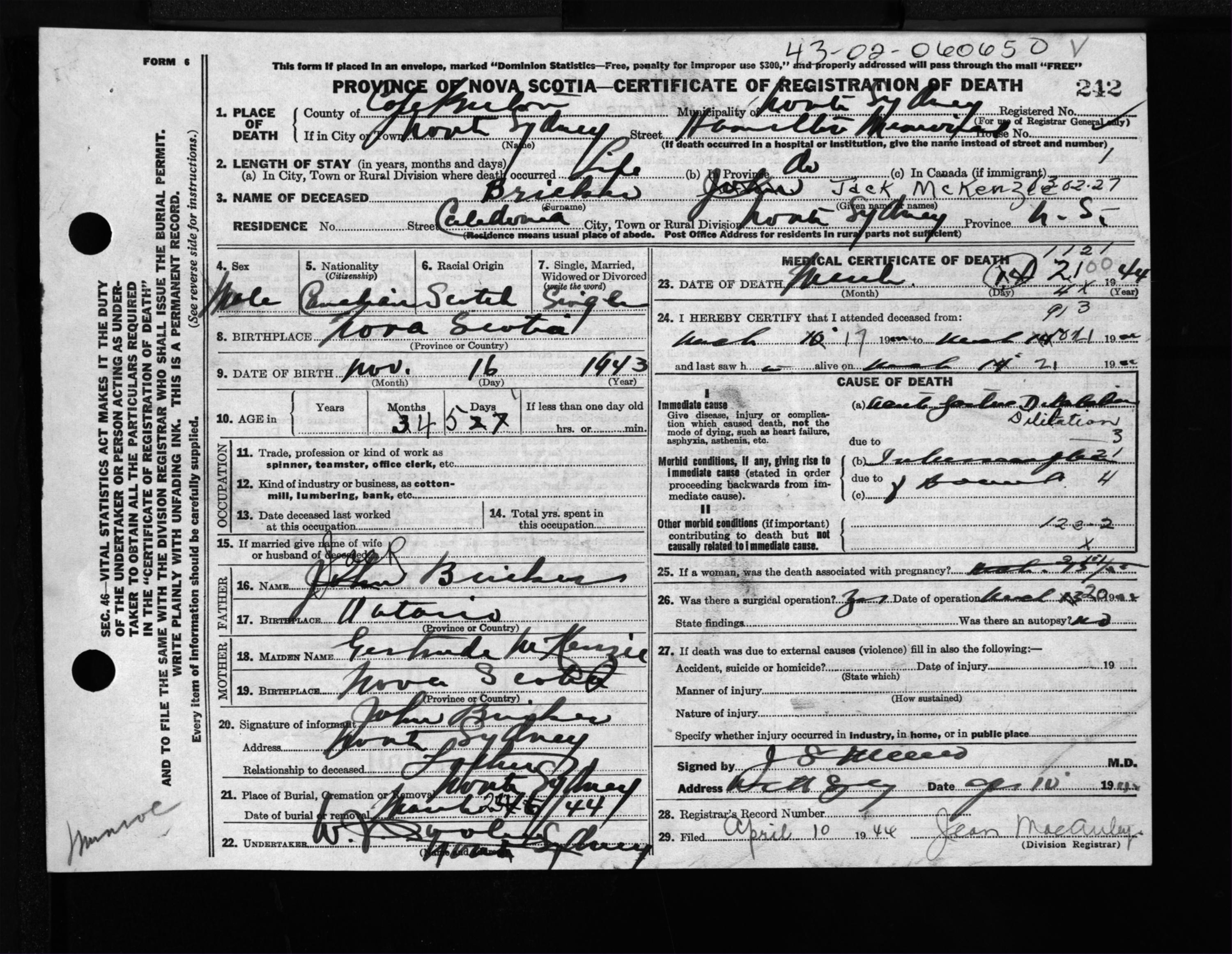 Male Death Registration: Year: 1944 file: 217 number: 242