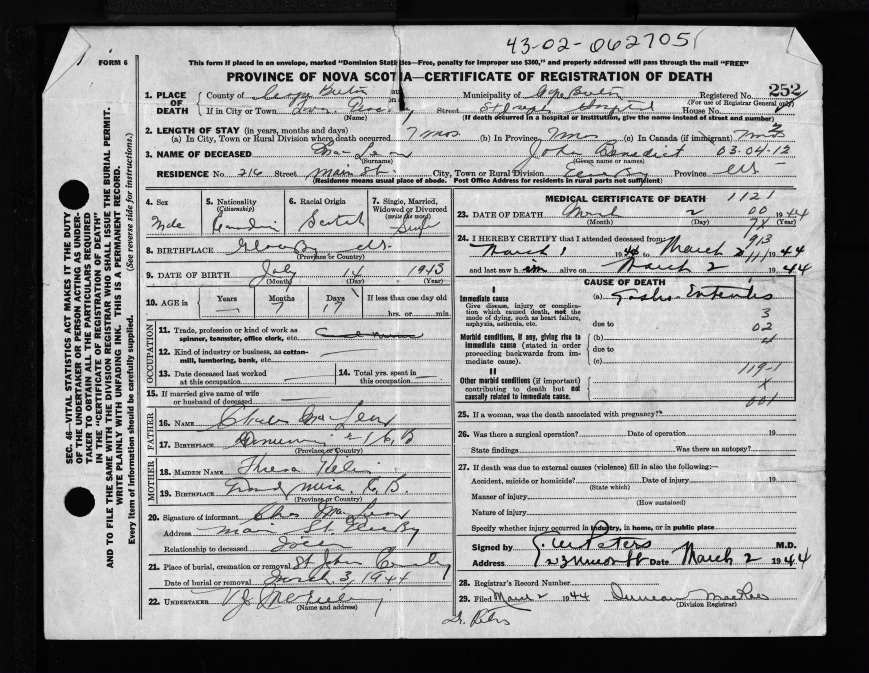 Male Death Registration: Year: 1944 file: 217 number: 252