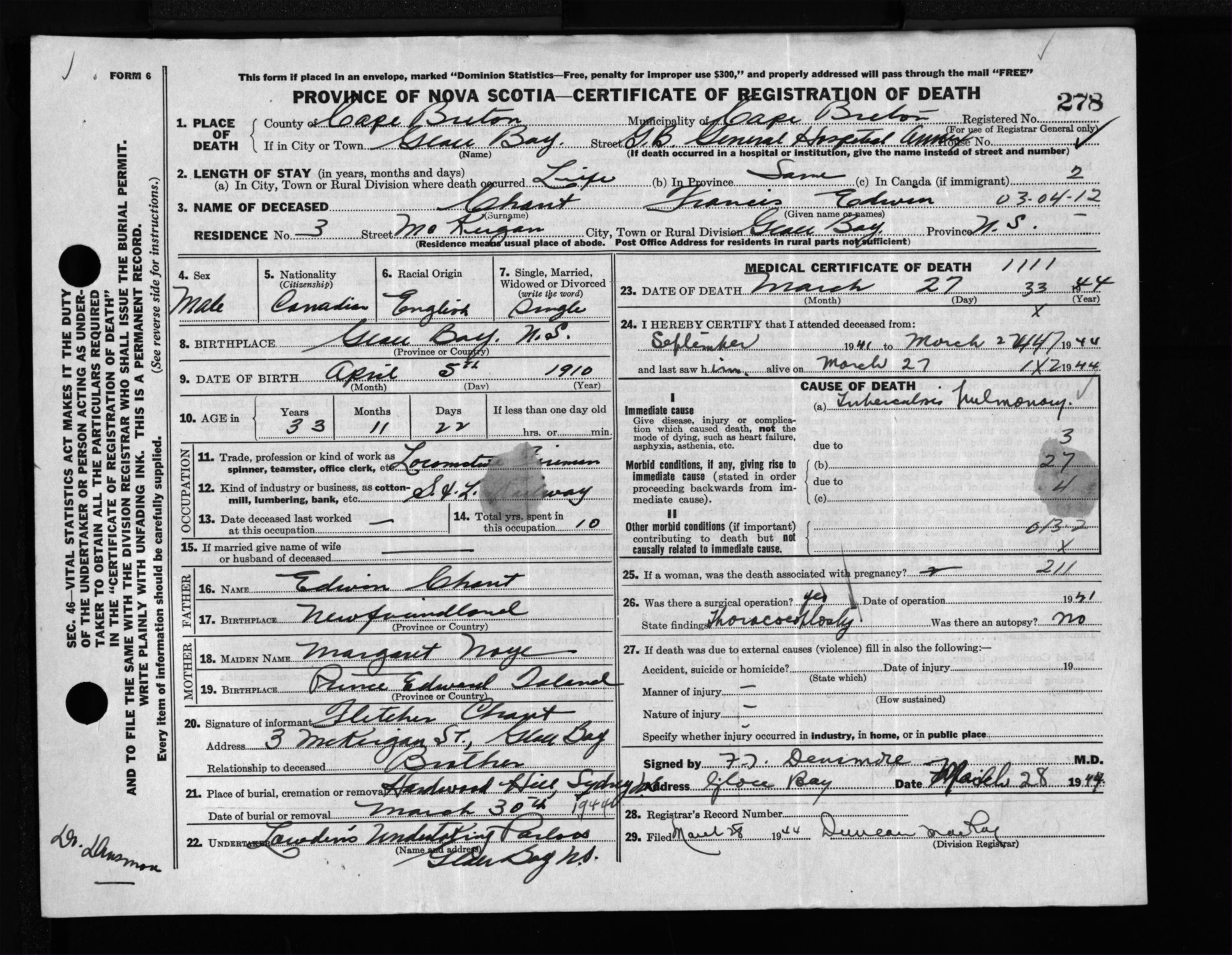 Male Death Registration: Year: 1944 file: 217 number: 278
