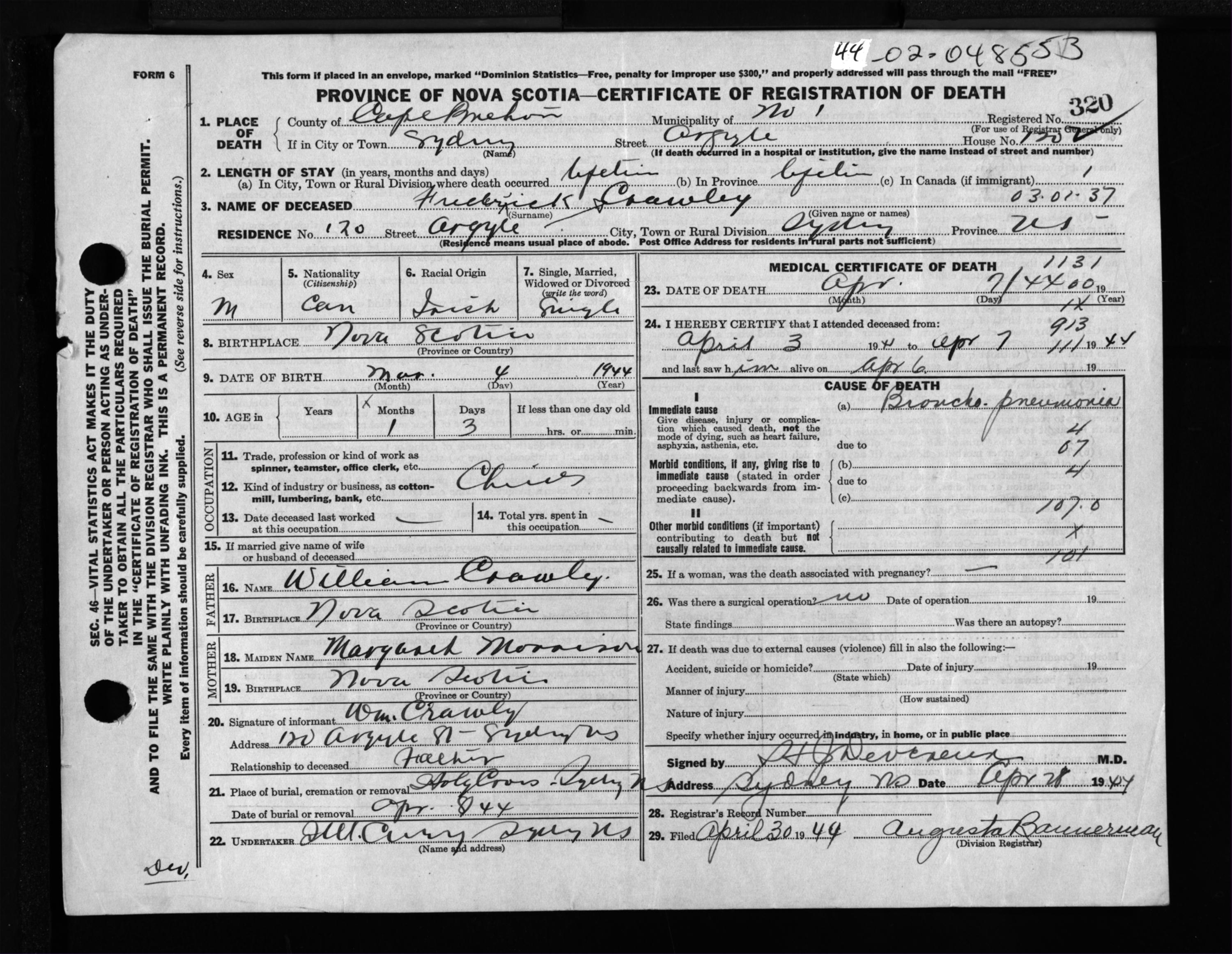 Male Death Registration: Year: 1944 file: 217 number: 320