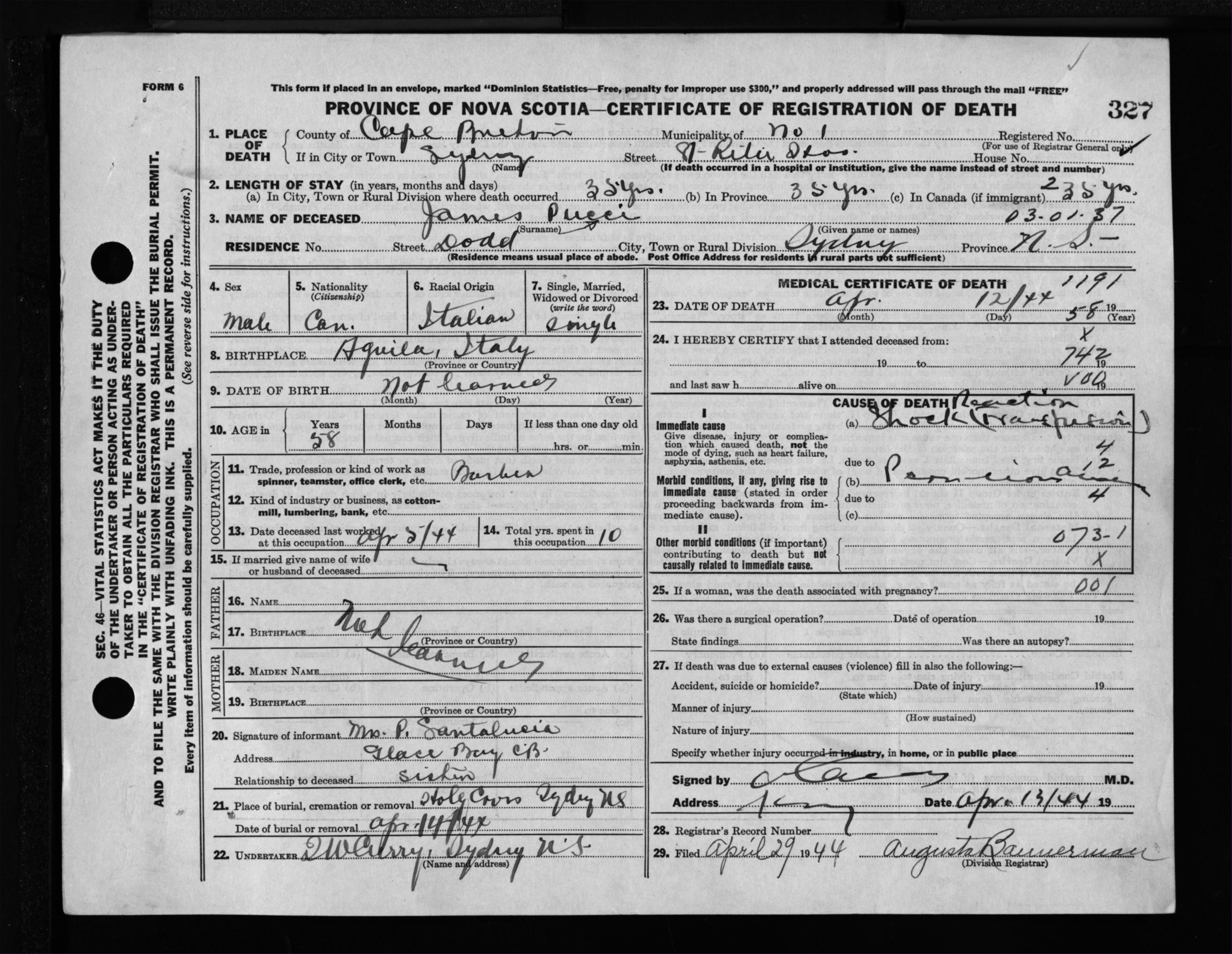 Male Death Registration: Year: 1944 file: 217 number: 327