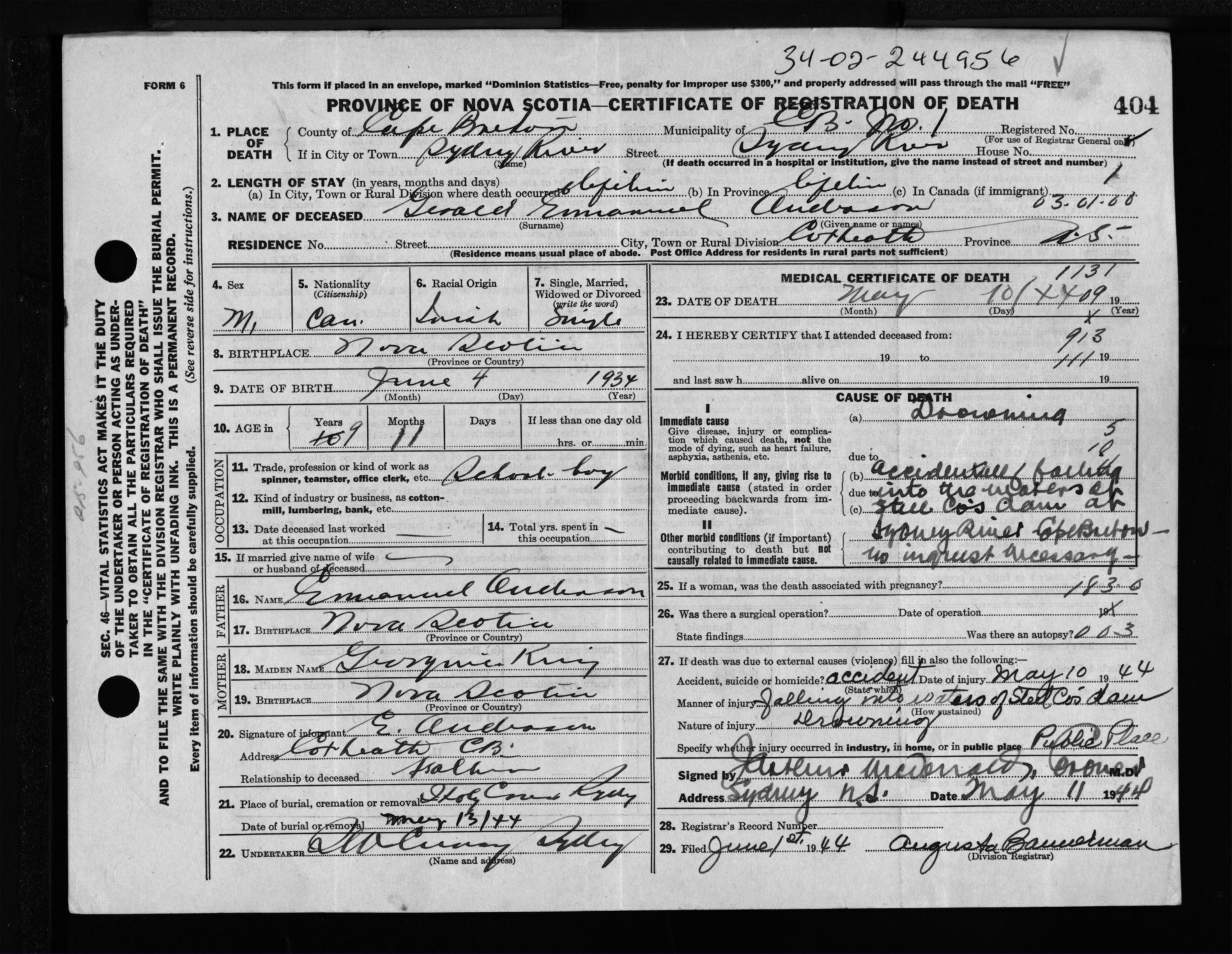 Male Death Registration: Year: 1944 file: 217 number: 404