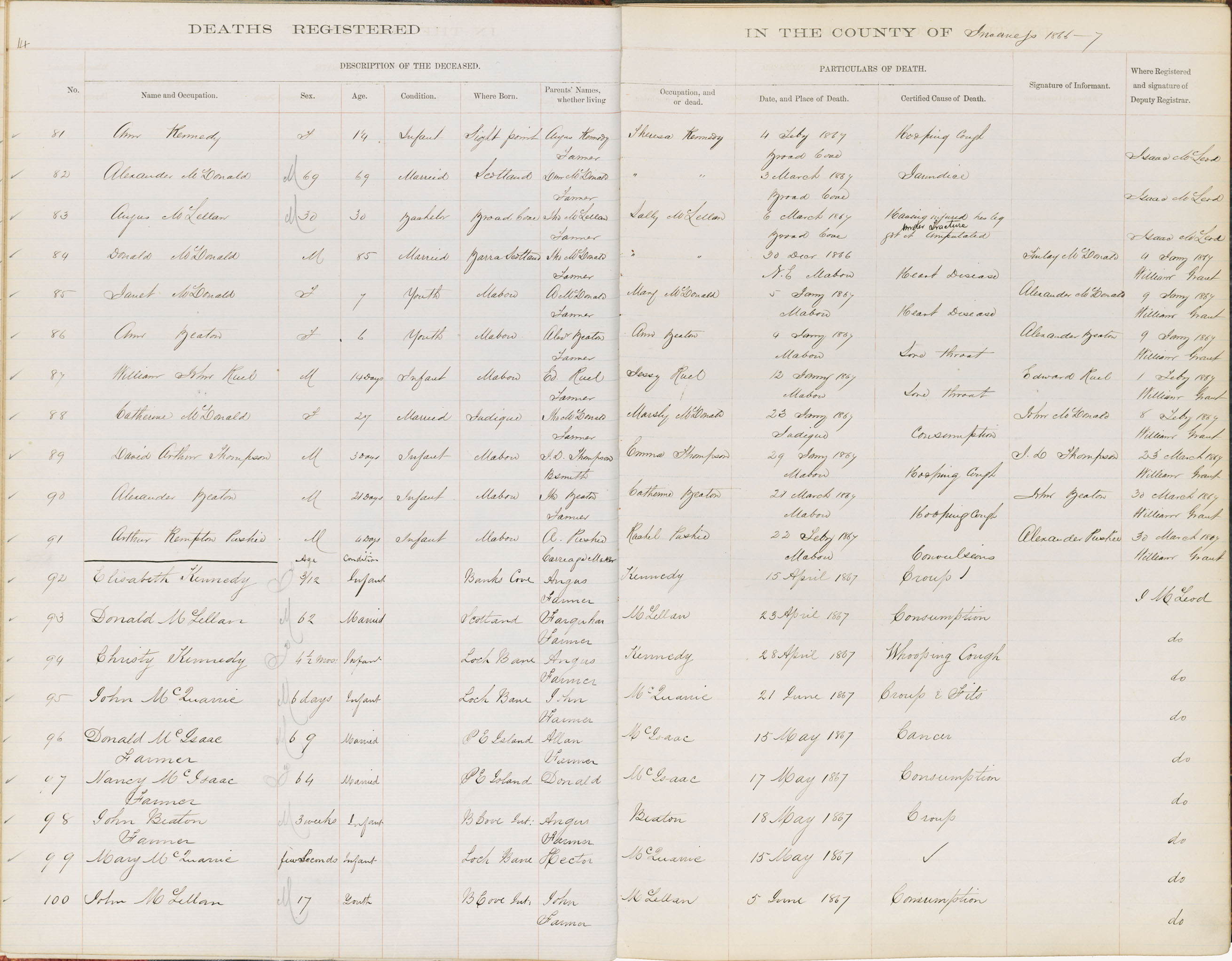 Male Death Registration: Year: 1867 book: 1810 page: 14 number: 100
