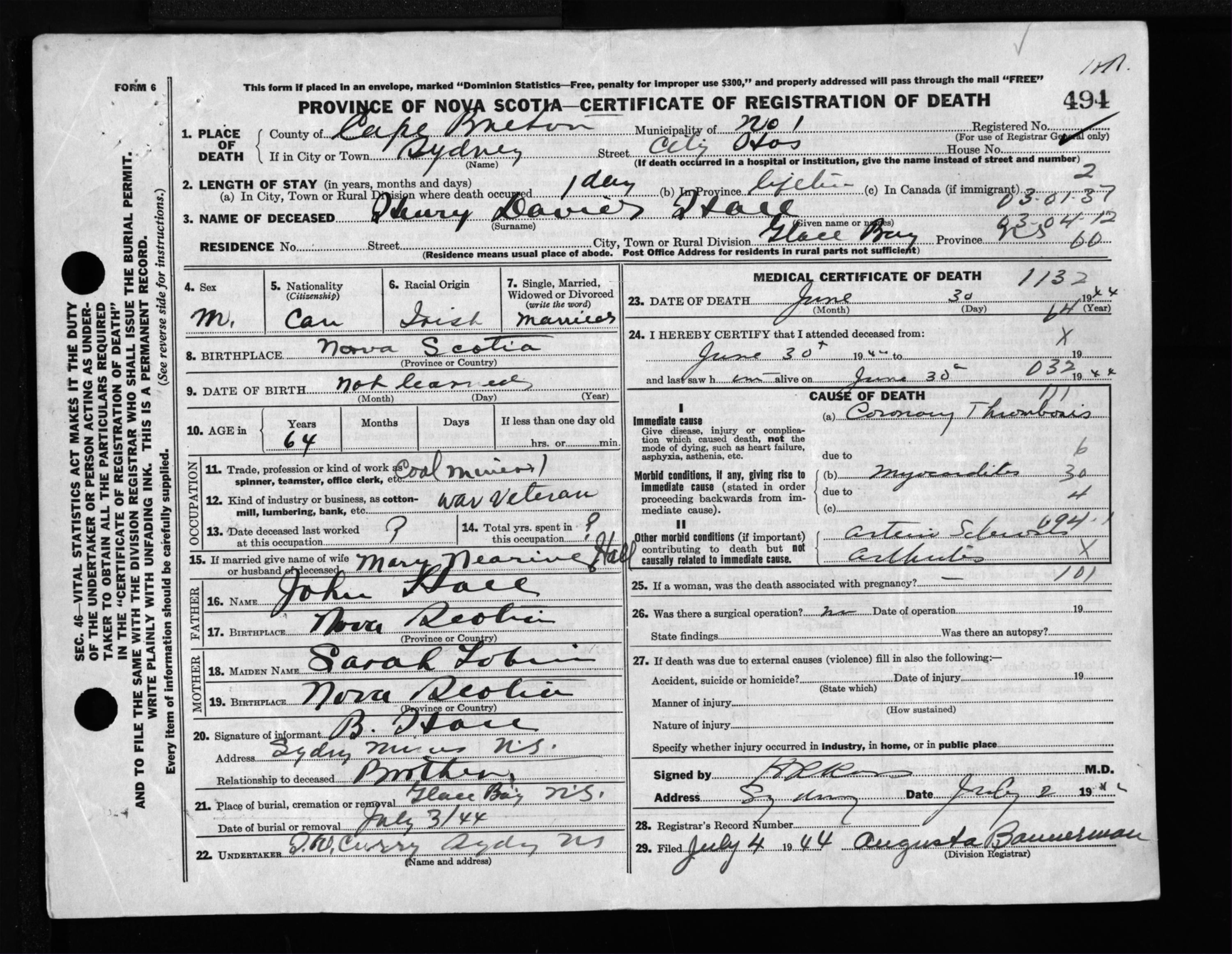 Male Death Registration: Year: 1944 file: 217 number: 494