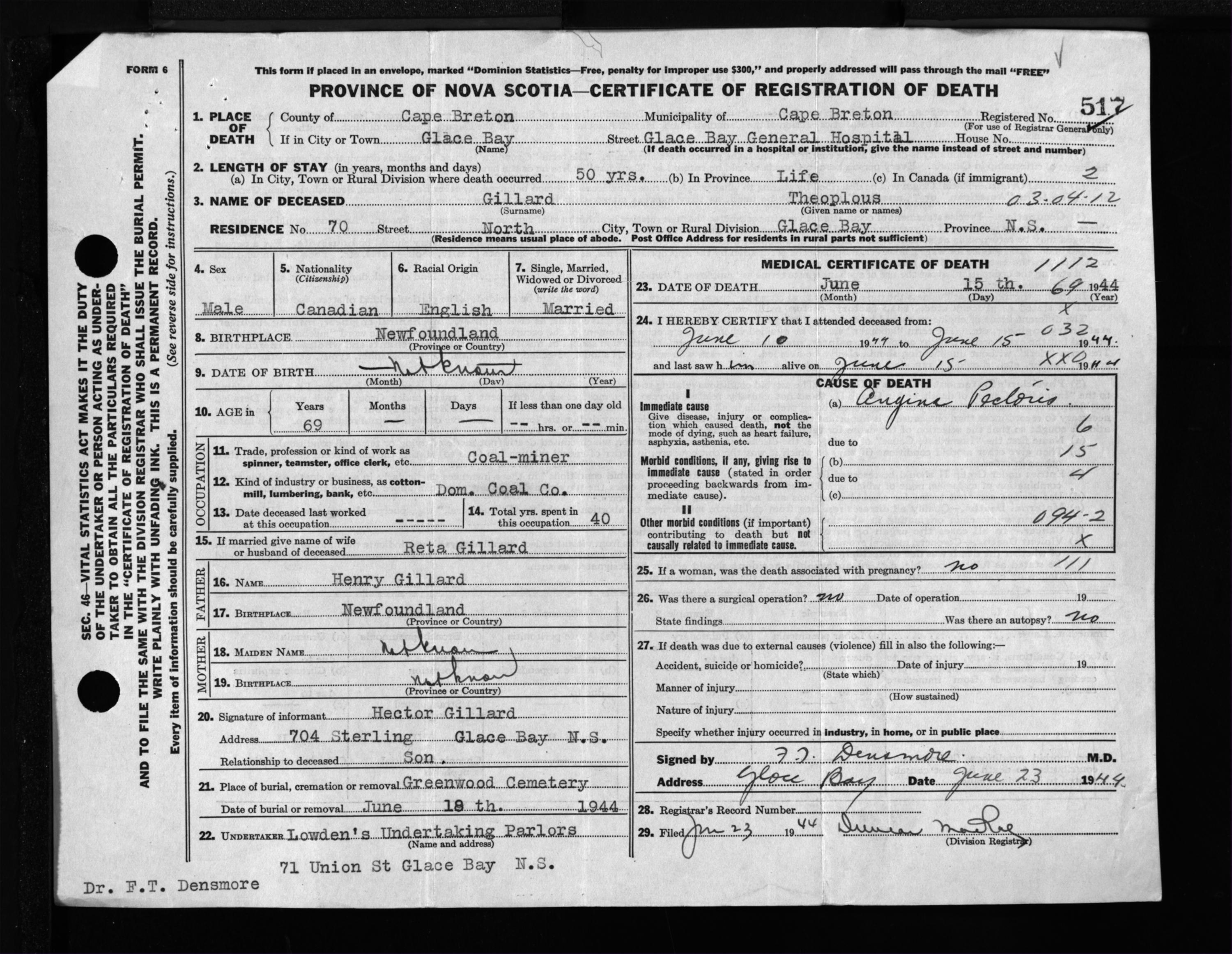 Male Death Registration: Year: 1944 file: 217 number: 517