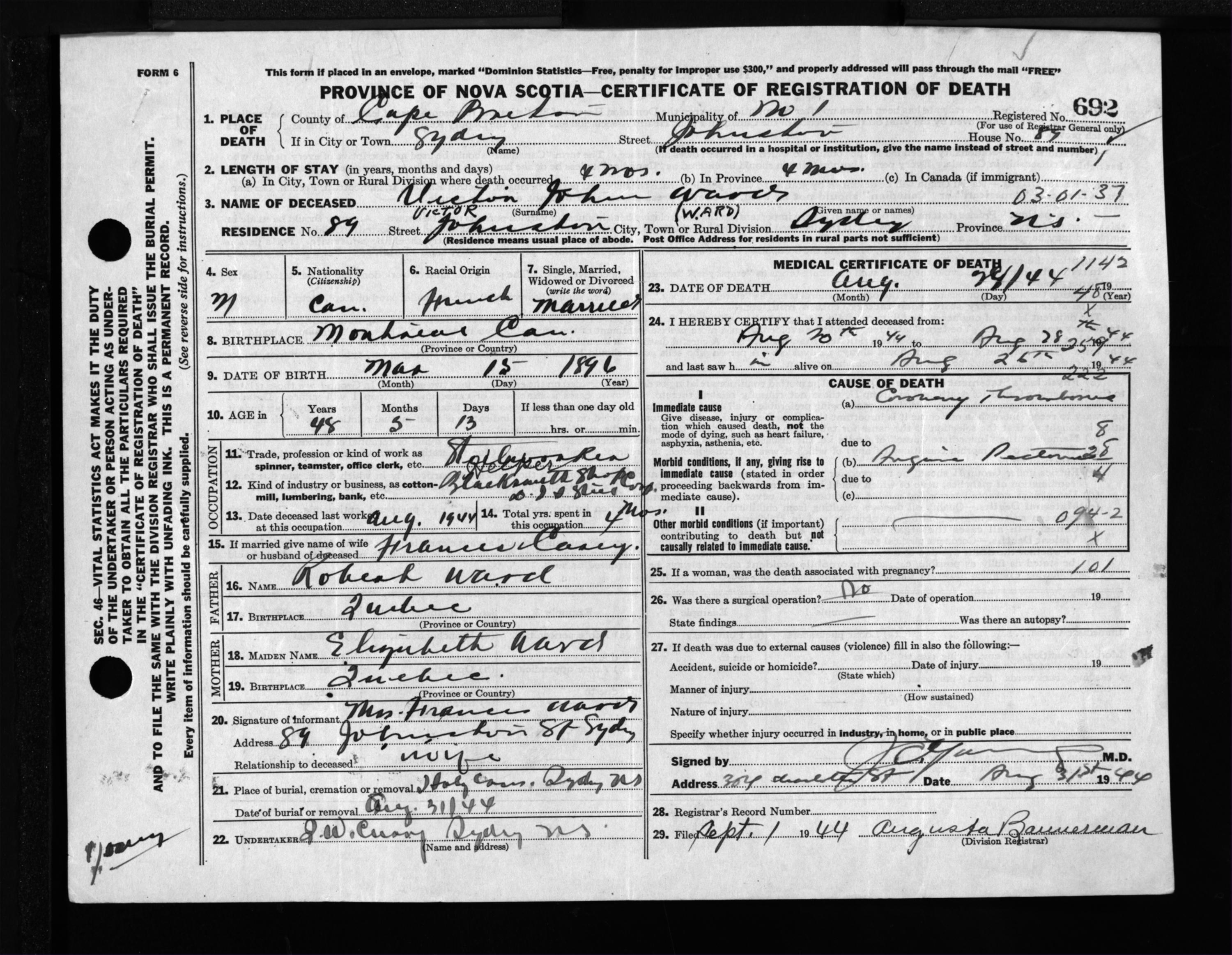 Male Death Registration: Year: 1944 file: 217 number: 692