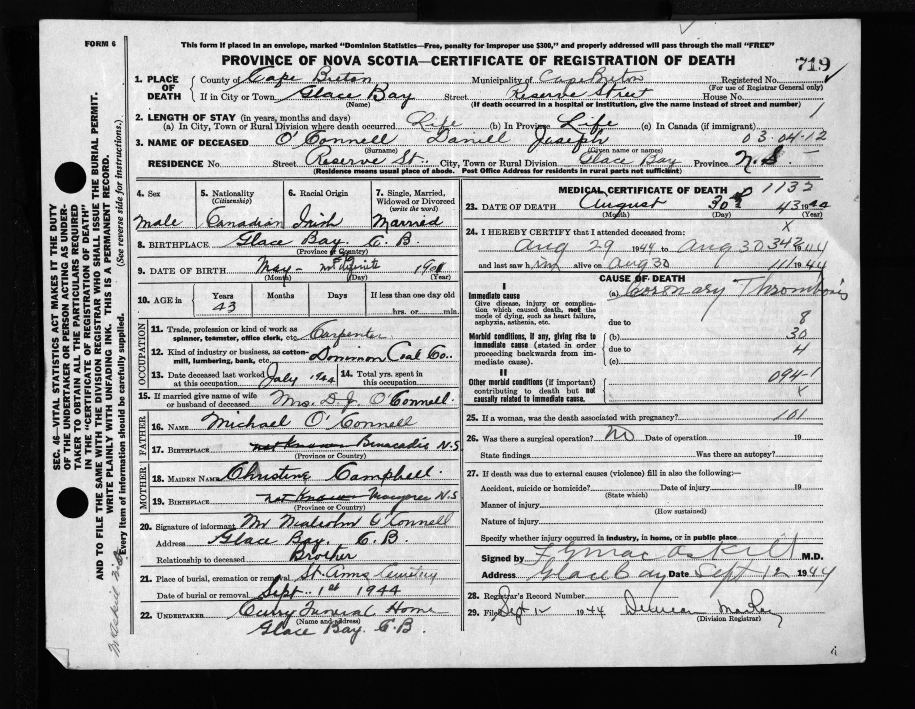 Male Death Registration: Year: 1944 file: 217 number: 719
