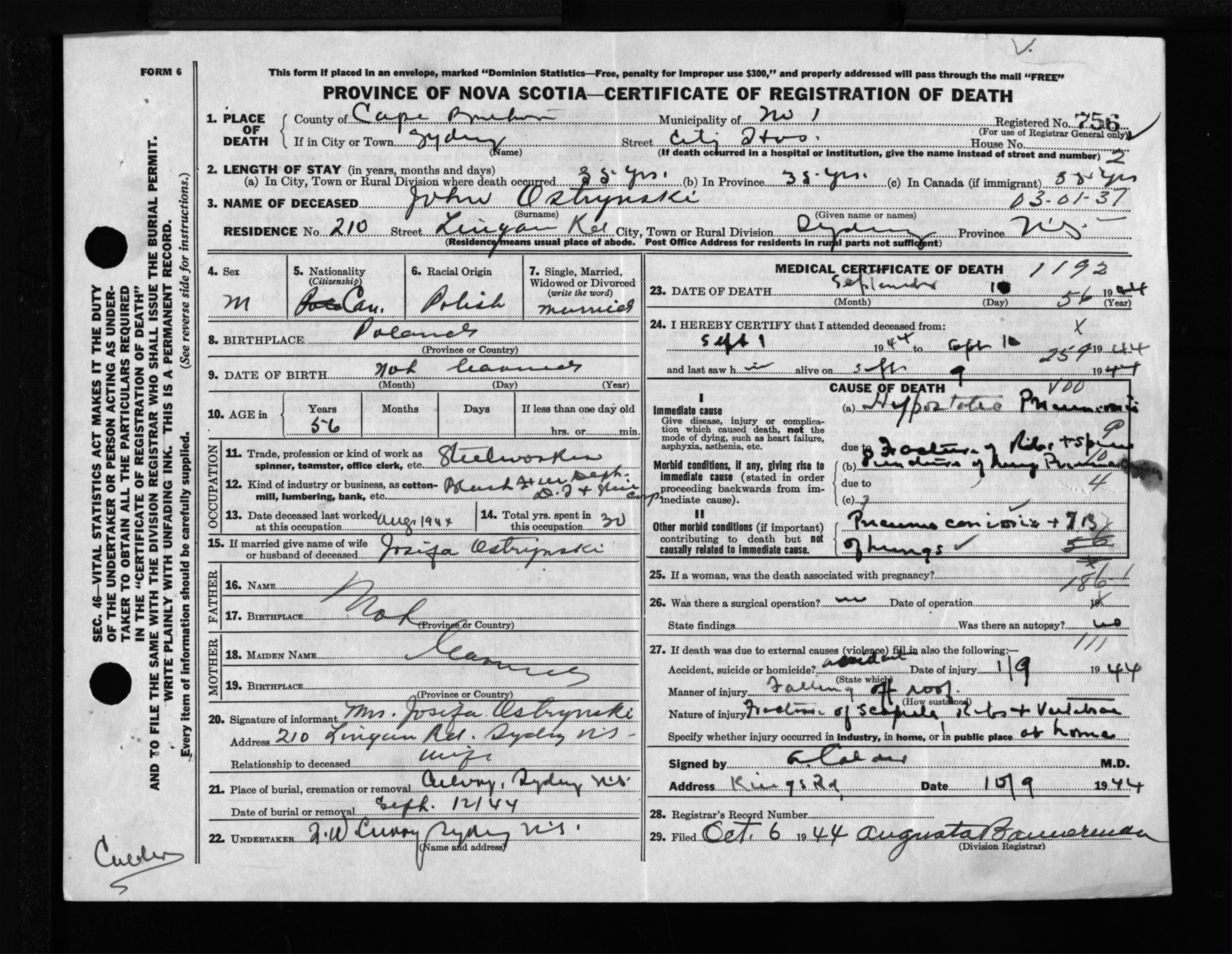 Male Death Registration: Year: 1944 file: 217 number: 756
