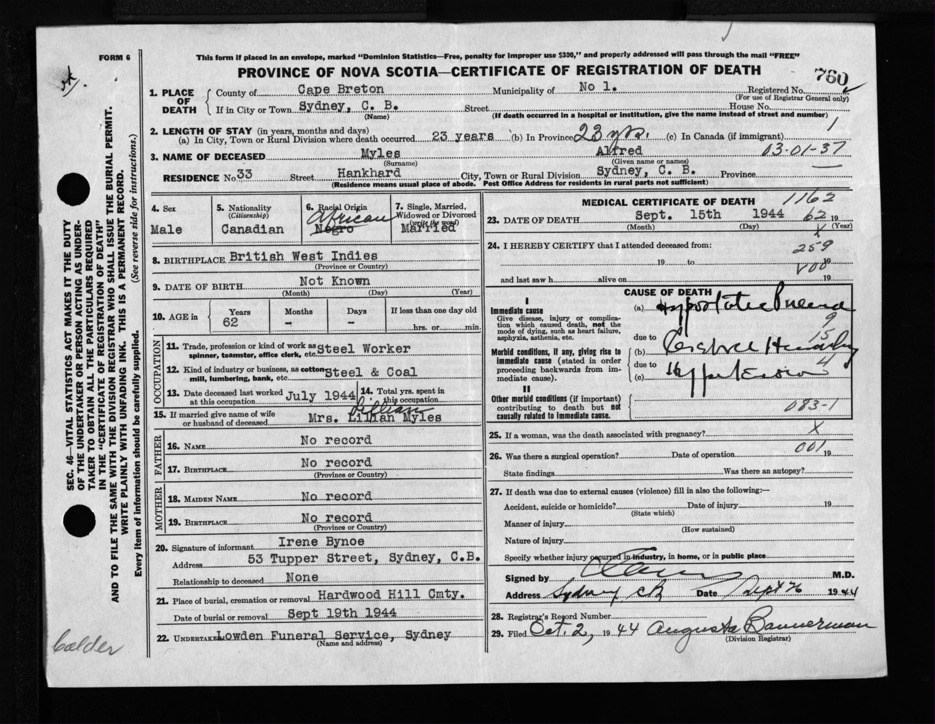 Male Death Registration: Year: 1944 file: 217 number: 760