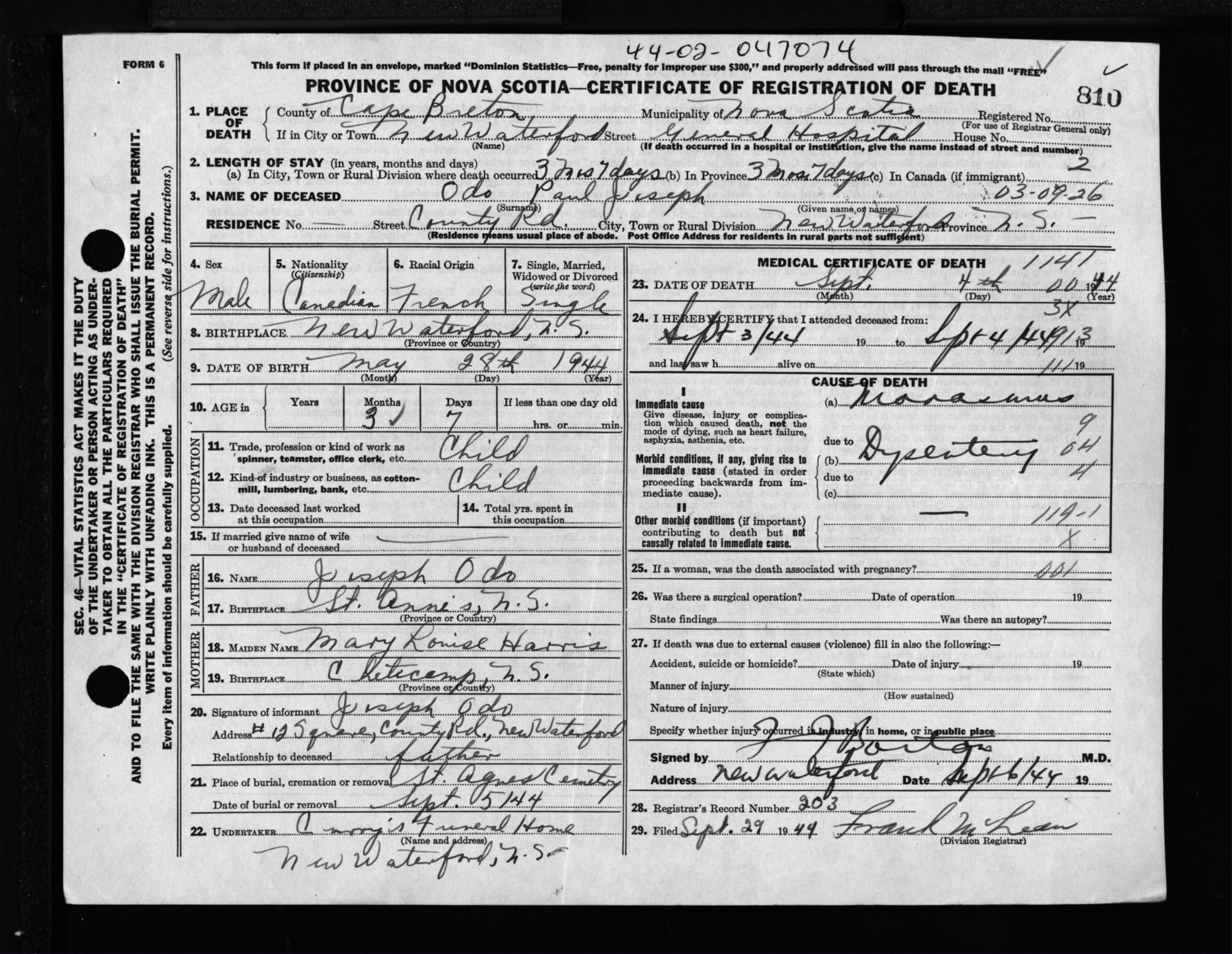Male Death Registration: Year: 1944 file: 217 number: 810