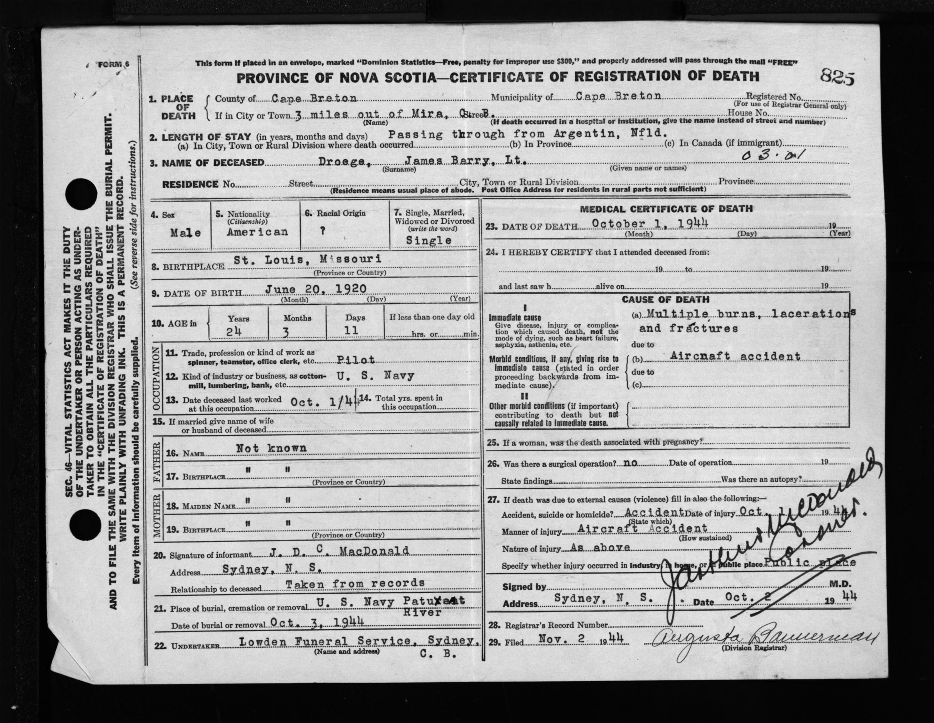 Male Death Registration: Year: 1944 file: 217 number: 825