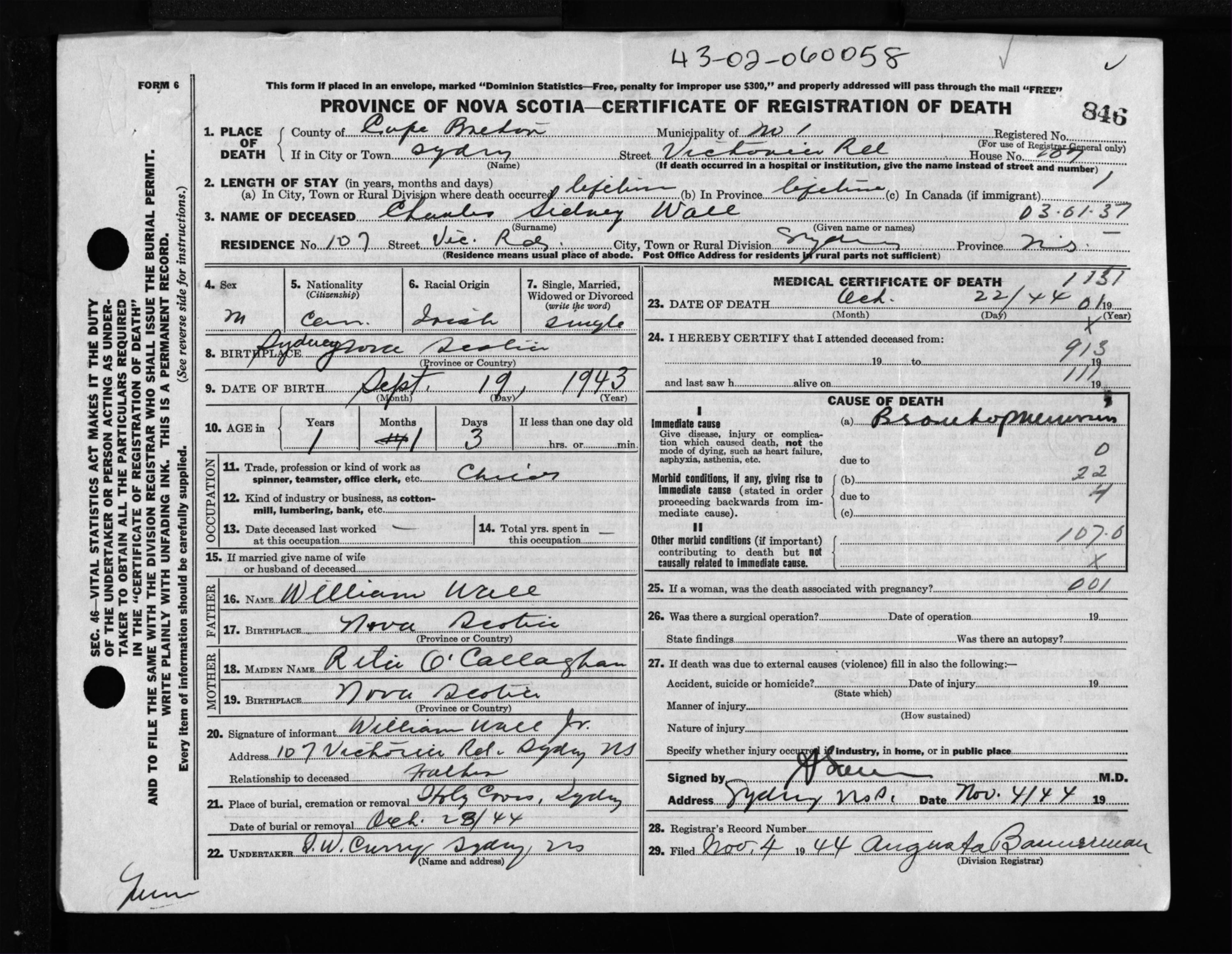 Male Death Registration: Year: 1944 file: 217 number: 846