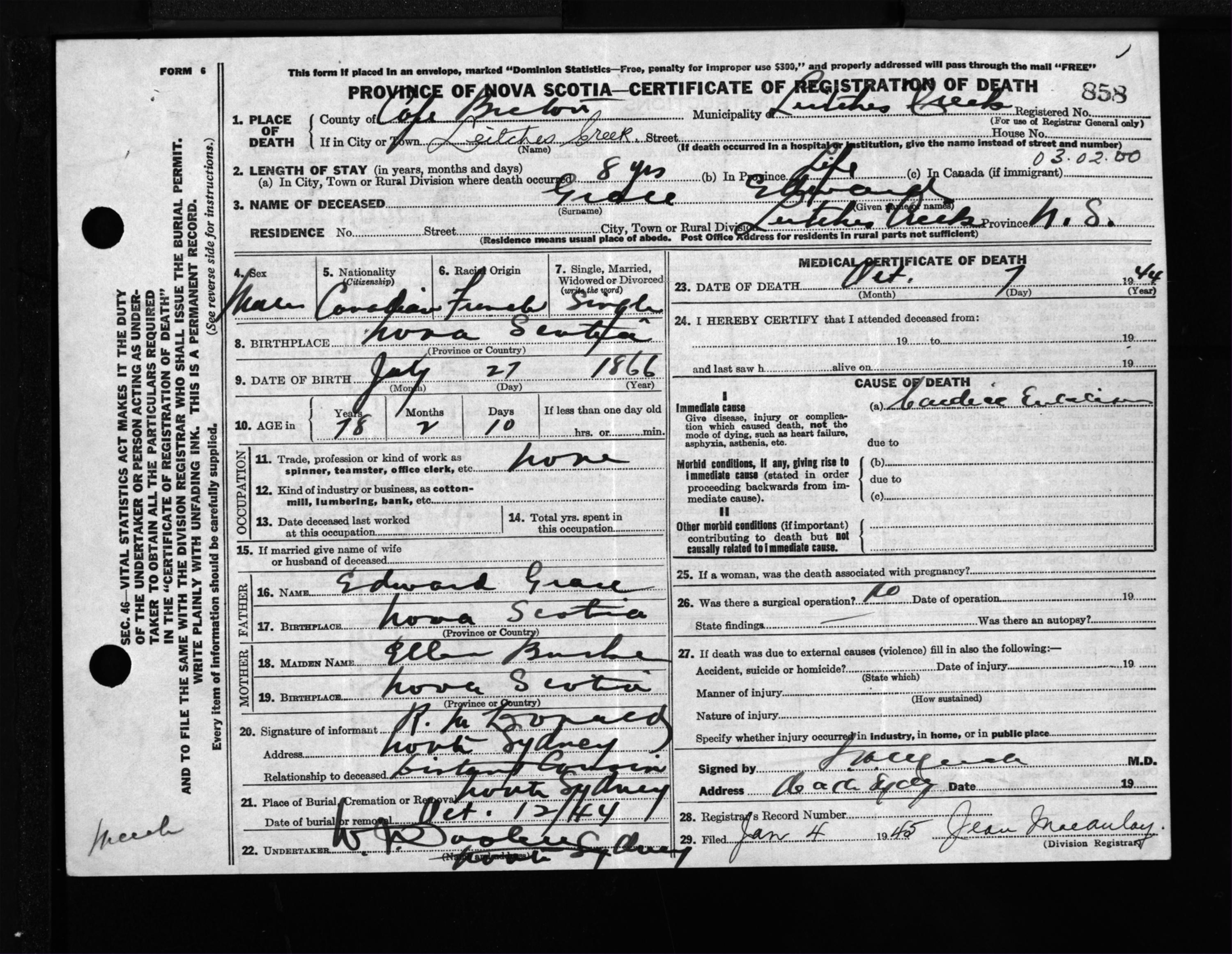 Male Death Registration: Year: 1944 file: 217 number: 858