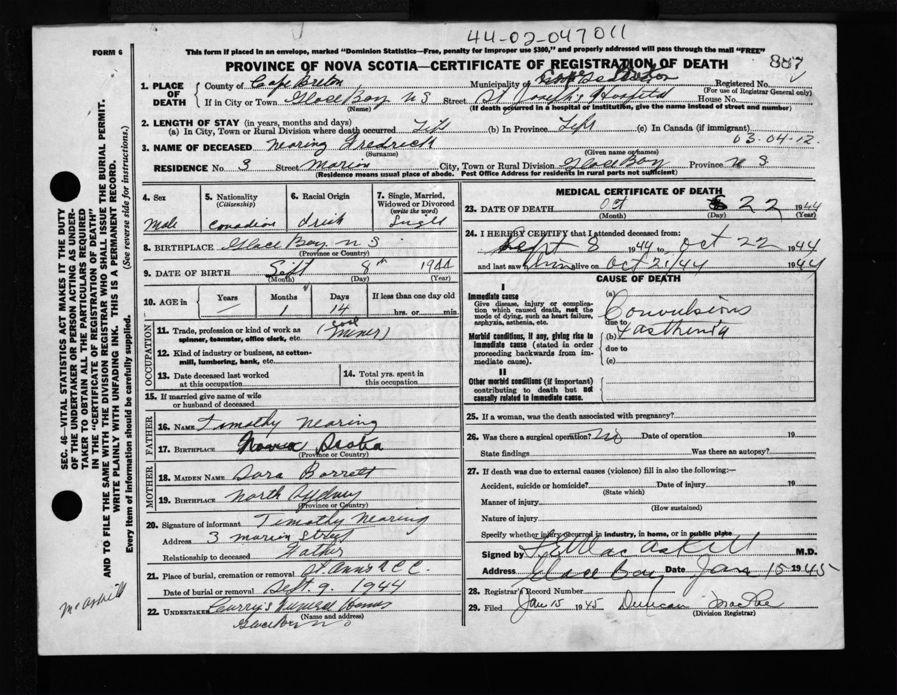 Male Death Registration: Year: 1944 file: 217 number: 887